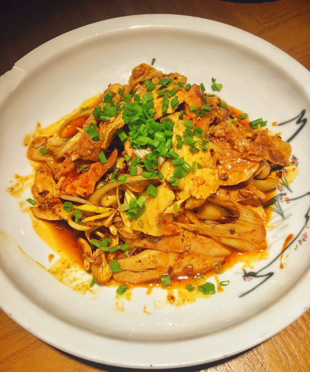 缘贡土鸡片:土鸡片大多是带点鸡皮的鸡肉片,加了葱片,口感清爽,撒上秘制红油,辣度刚刚好。