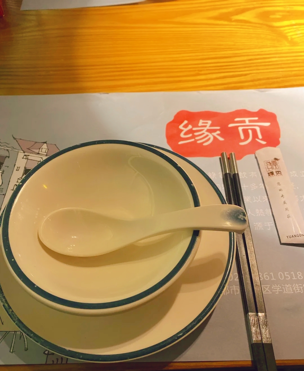 这里确实是一个不错的地方,休闲娱乐,应有尽有。不知不觉在这里玩了三个多小时,都已经四点多了,难不怪觉得有点饿了,看来出门玩果然是饿的快啊。接下来就准备向我们的最终目标地出发,春熙路的缘贡,超级火爆的,一直听同事说起,这次终于抓到机会来拔草了。看了下导航,还是不远的,赶个公交车就过去了。