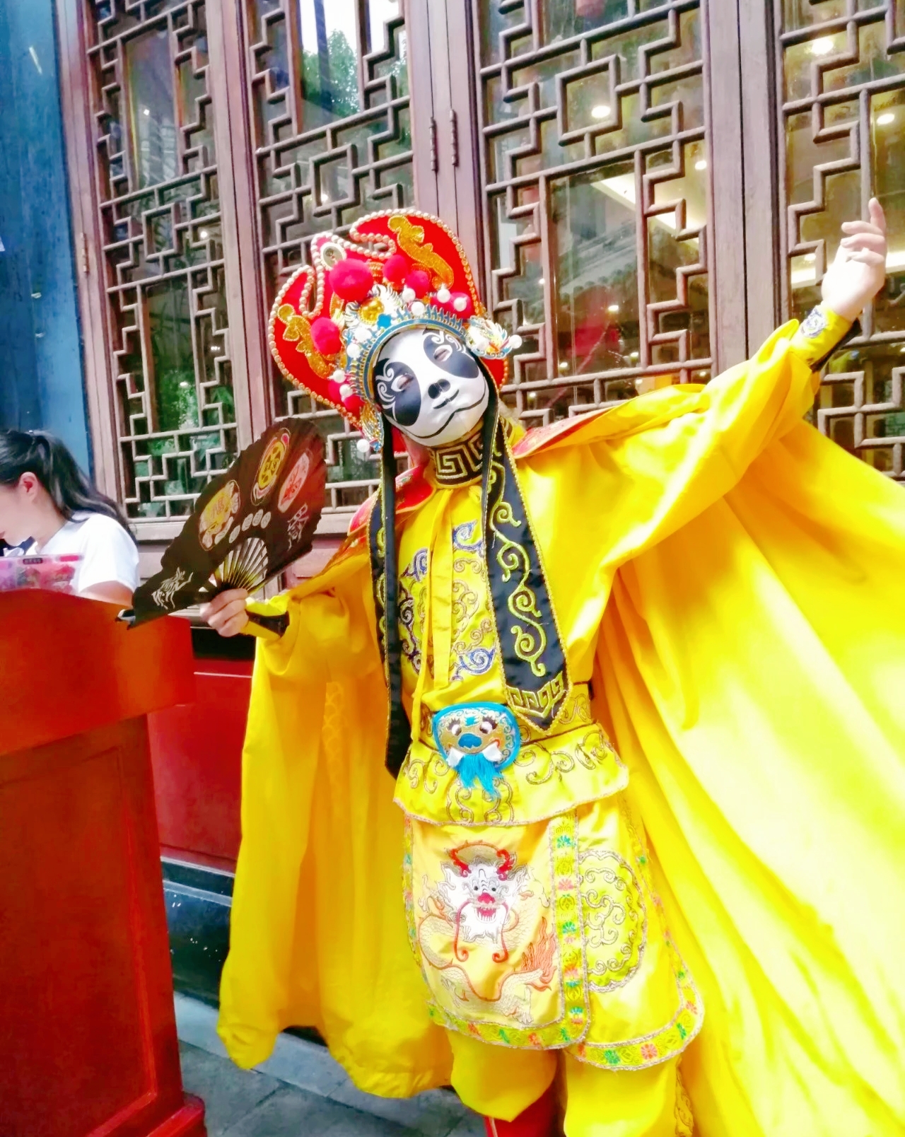 门店旁边,有化妆的川剧小生招呼迎客。他们比划着戏文里的动作,猛的一缩脖伸头,白脸就变成红脸,吓人一跳,你还不及诧异生气,他就拉着你做个鬼脸逗你“噗嗤”一笑,这一逗一乐,心情瞬间就好了。