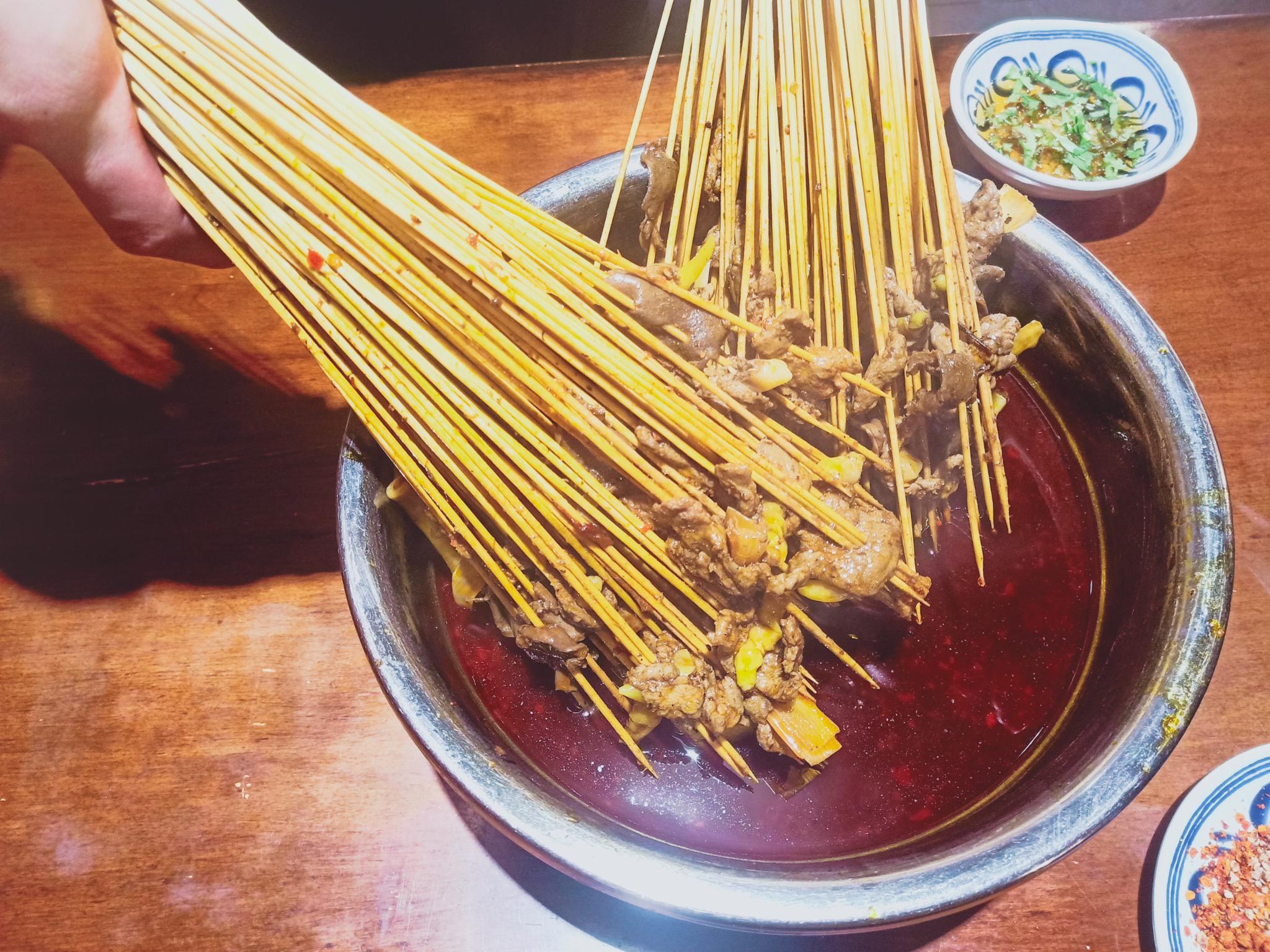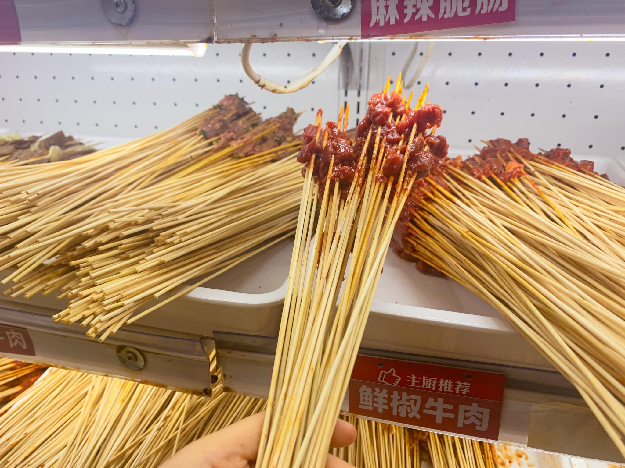 牛肉串串是百搭:给我一片牛肉,就能卷出一个世界,五香、麻辣、香菜、泡椒、大葱,牛肉要通过秘制酱料腌制两三个小时,一颗颗饱满的泡椒加上软嫩的牛肉,一丝丝绿色加在红色的牛肉中间格外显眼,吃进嘴里在舌尖爆发出的重口味,在厚实的牛肉粒中,裹着随时准备爆汁儿的泡椒,嘴上说着不要身体十分诚实,一串串地往嘴边送。