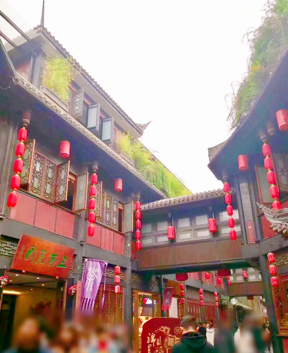 我们初去时,天空一片晴朗,漫步锦里,游人较少,倒别有一番朦胧古典的意蕴。锦里街巷并不是宽,但两旁古楼相向而望,串串红灯笼高高低低地,或挂在飞檐翘角下,或挂在树枝上,在朦胧的雨中,闪闪烁烁,独具风韵。