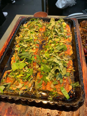 烤鱼最爱这家,还有很多好吃的小吃。 「黄金酸辣味烤鱼」,海南黄灯笼椒,很辣的,需要配着米饭吃,这里面的土豆片超入味。 「黑椒猪颈肉」烤猪颈肉,油脂丰富,肉质弹嫩。但是吃不了几口会腻。 推荐烤鱼里加豆花,很吸味。