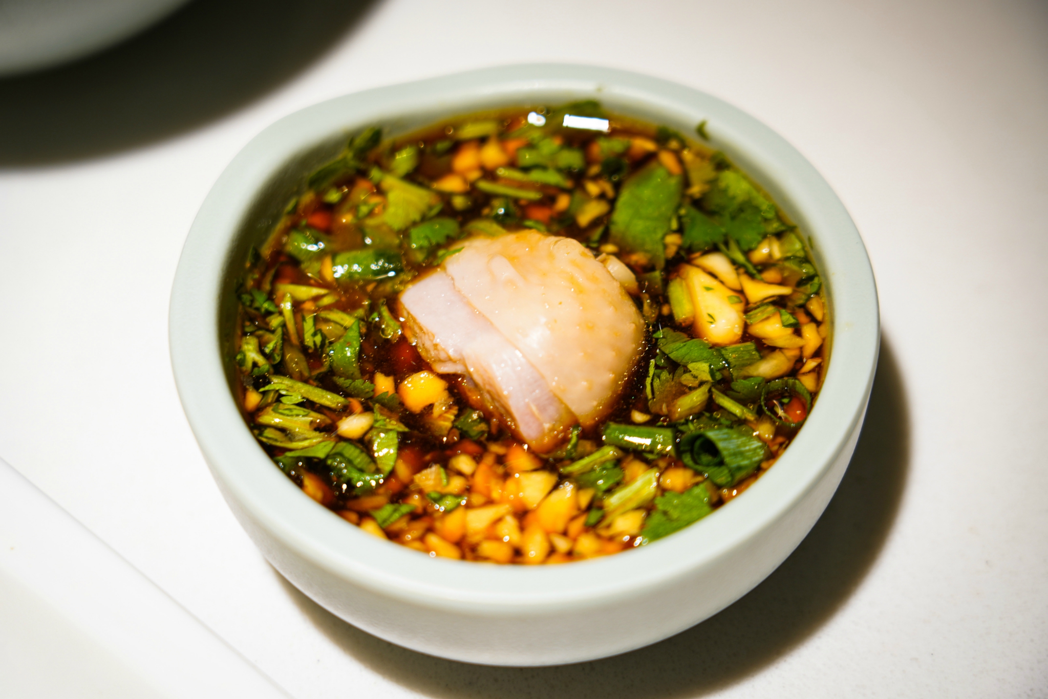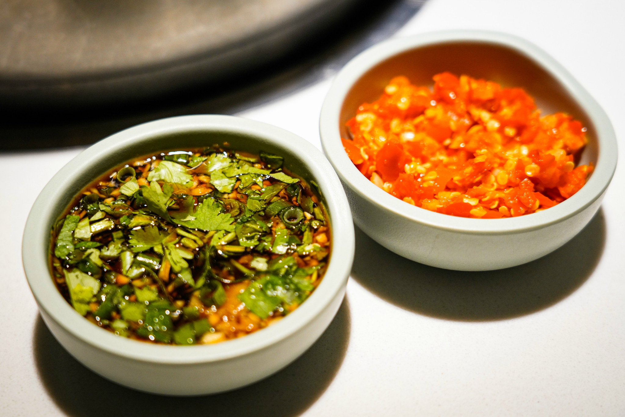 店家为了顾客需要,还准备了依云水,如果觉得汤汁太过甜腻,可以加进去少许稀释一下。还要推荐的是店家精心研制的酱料,涮出一片肉沾上这个秘制的酱料,味道简直绝了!我们研究半天,也没猜出来里面都添加了什么佐料。也是,如果被我们这种吃货菜鸟都猜出来了,店家的酱料怎么能称得上是秘制的呢?