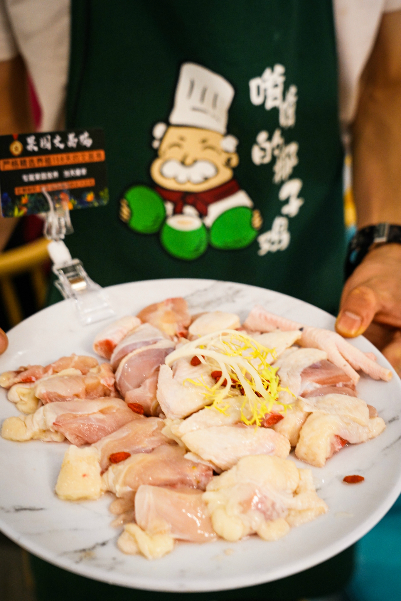 所谓的海南火锅,就是一个大锅里放三颗椰子的汁水,加入各色香料作为锅底。放入据说是,店家精挑细选的文昌鸡一起沸煮。煮出来的鸡肉,肉质鲜美,甜而不腻。入口鲜滑多汁,进肚后,口腔还留有回甘,简直令人回味悠长。本以为吃惯了辛辣的我们会觉得这火锅太甜腻,结果完全被这种特殊的滋味征服了。