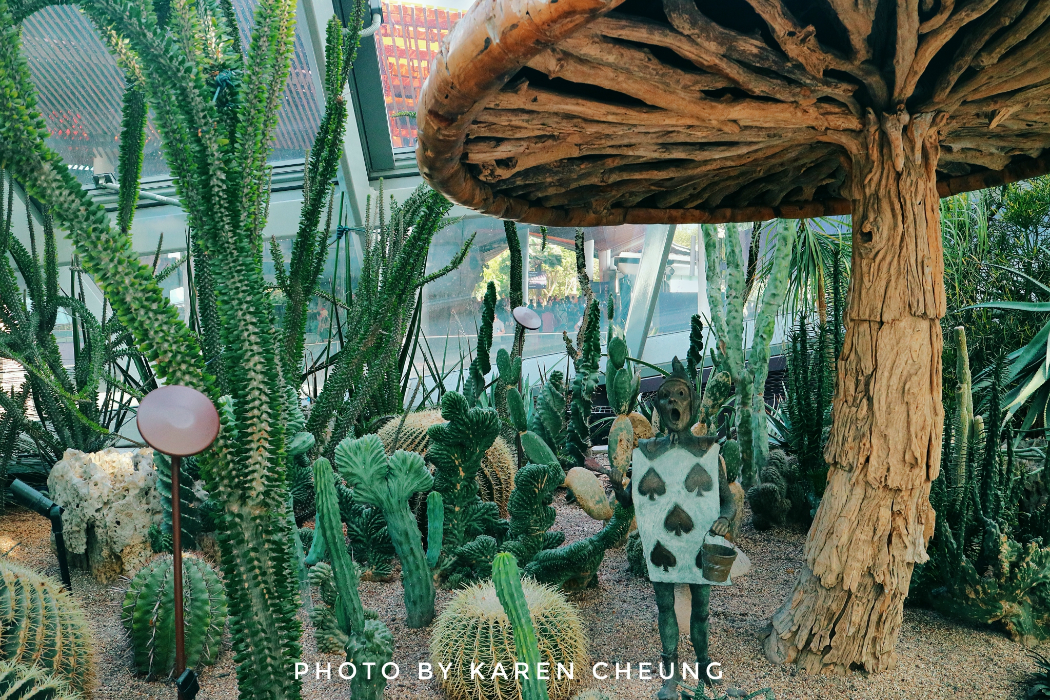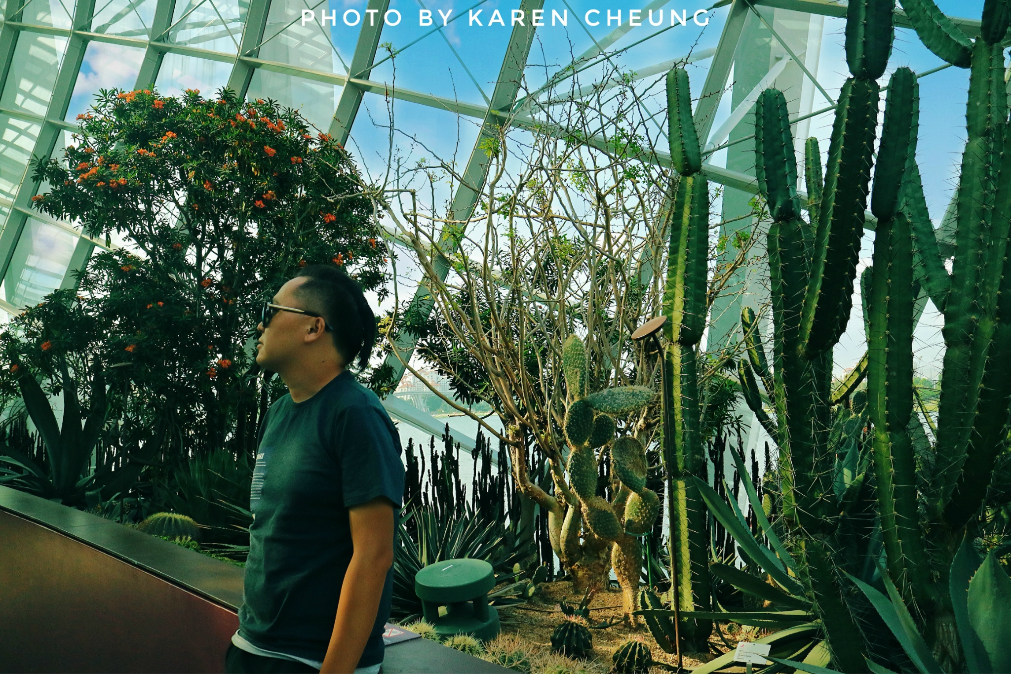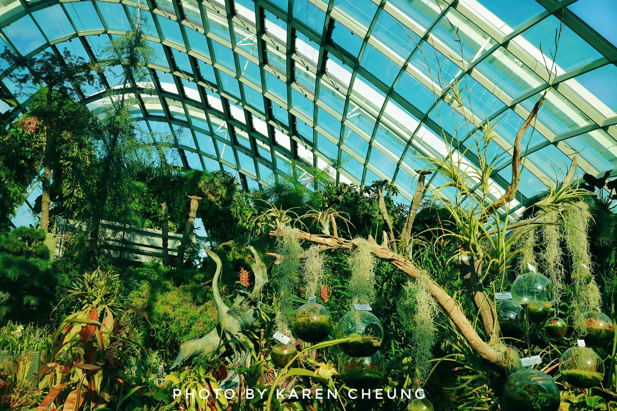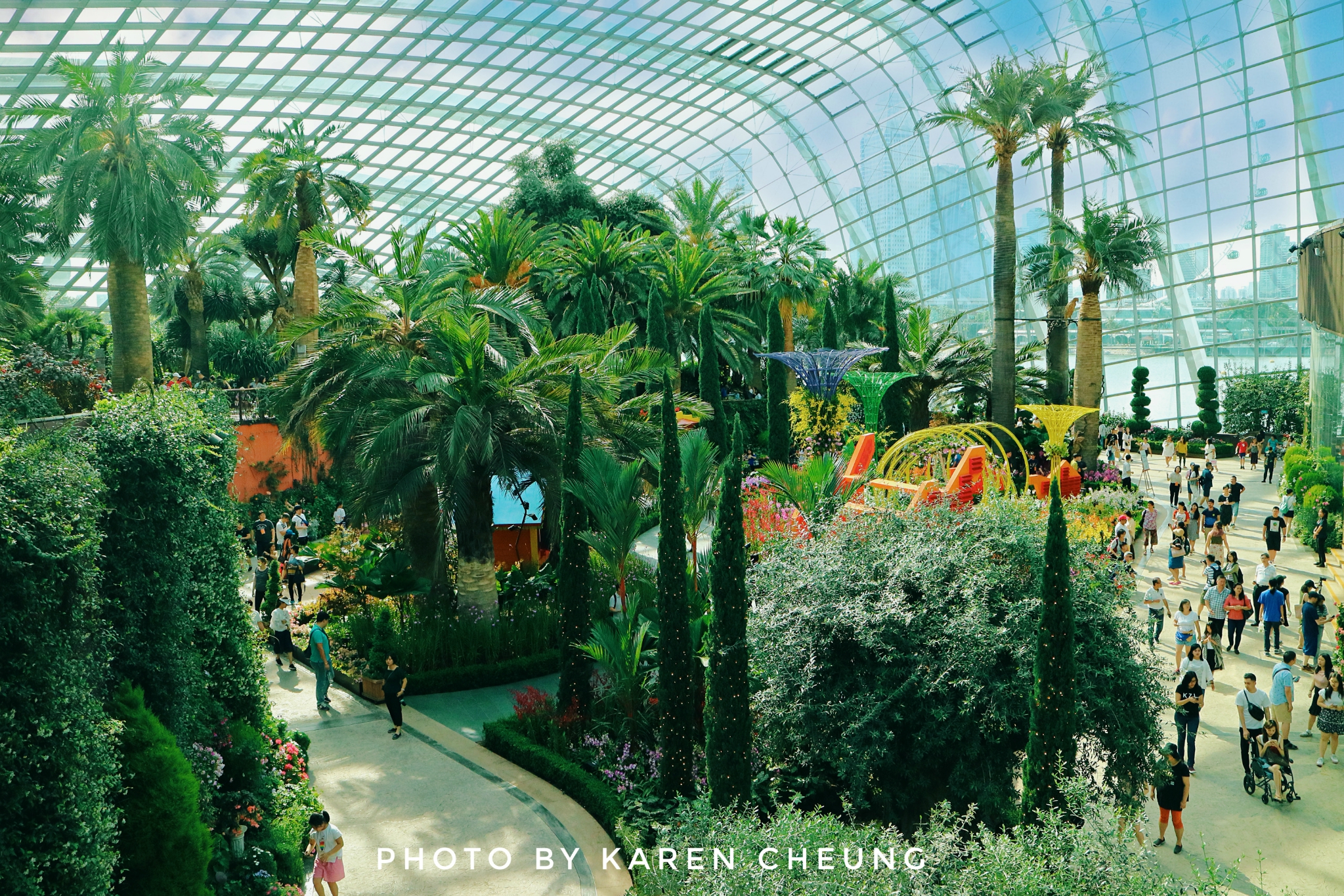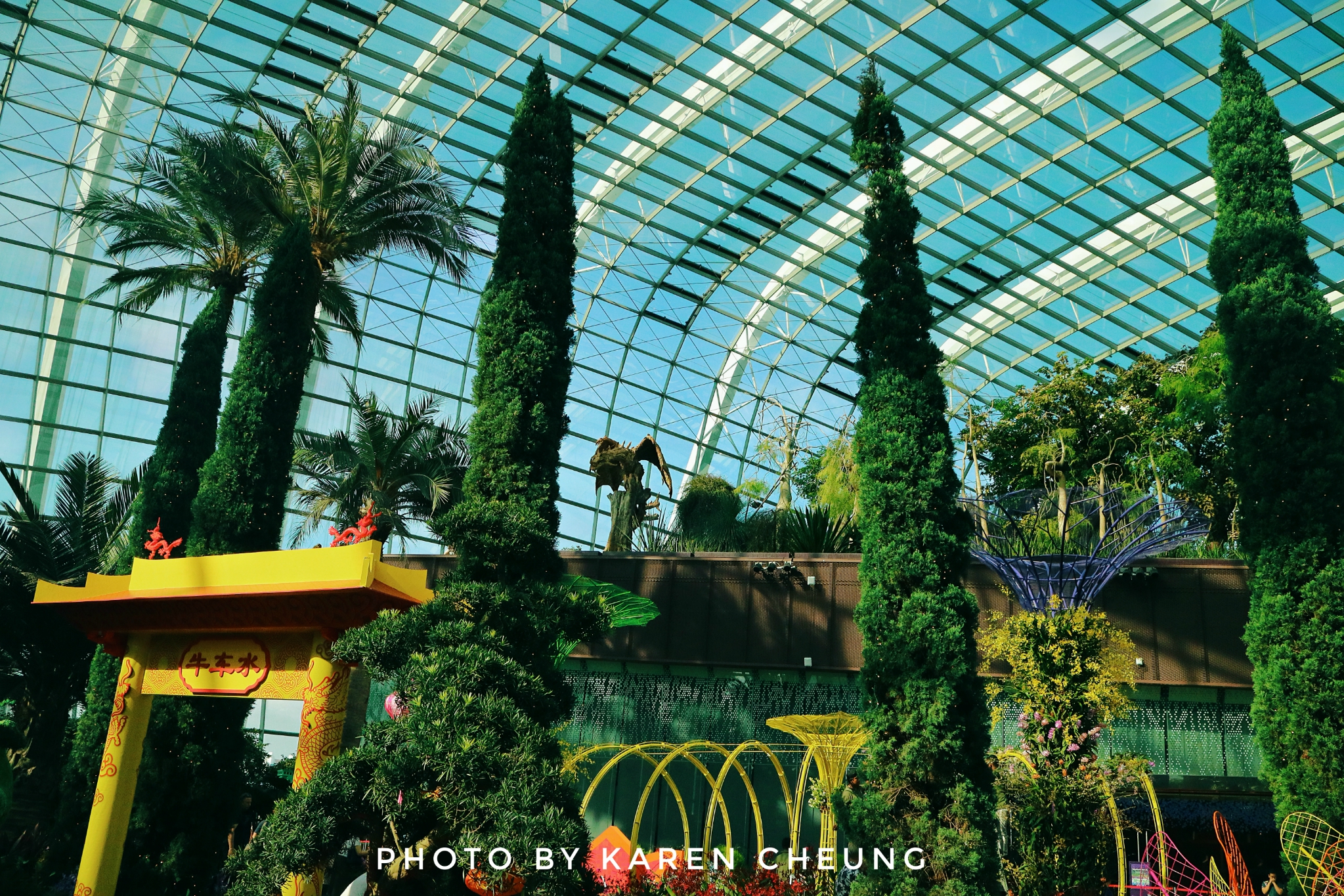 花穹主要展示地中海和亚热带地区的鲜花和绿植,可以看到不同地区的代表性植物。里面有9个不同的区域:猴面包树区域、肉质植物花园、澳大利亚 花园、南非花园、南美花园、加州花园、地中海 花园、橄榄林以及花圃。花圃区域会不定期举办特色花卉展, 比如碰巧遇上的这个牛车水文化展……