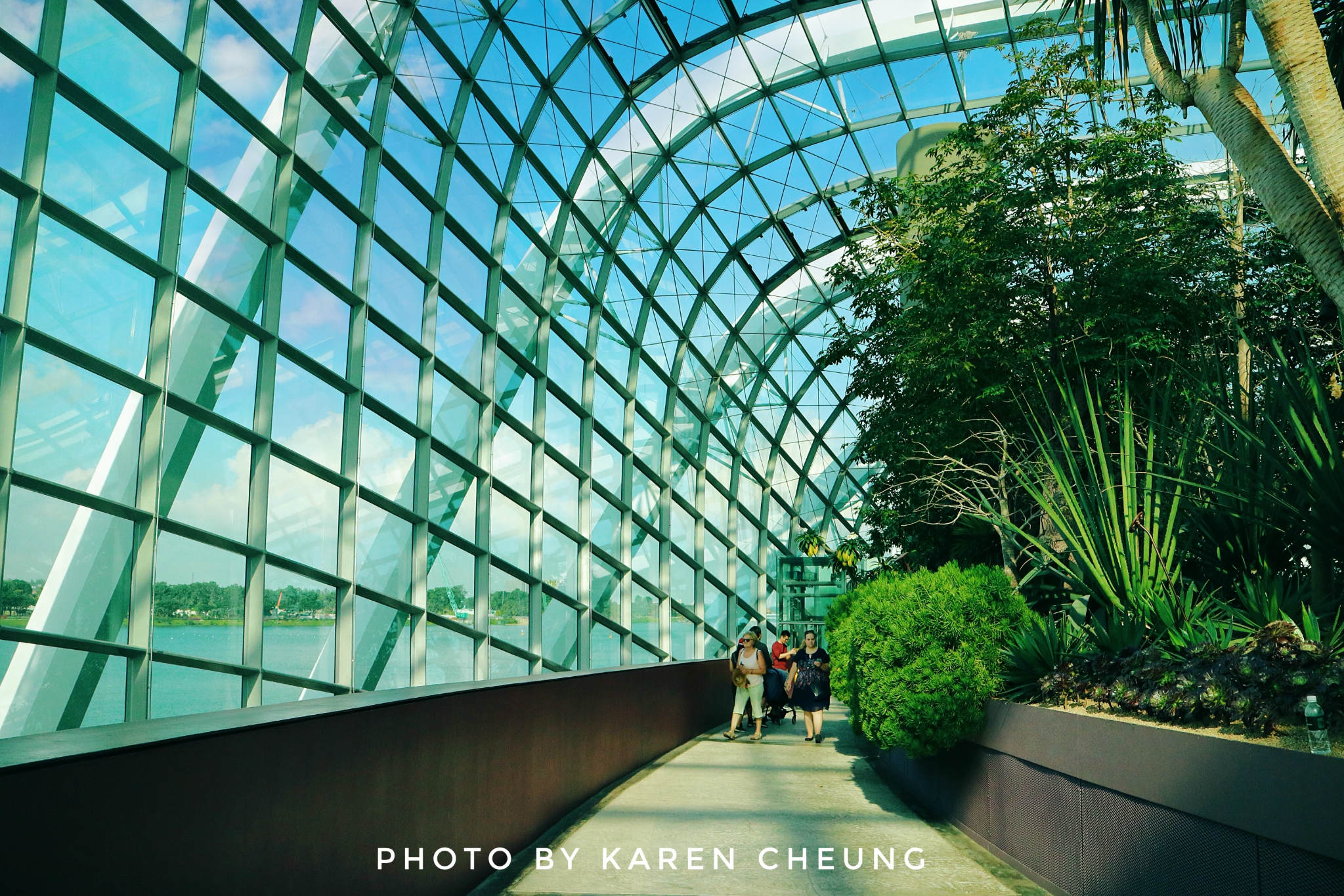 放眼望去,独立式无支撑玻璃屋顶覆盖广阔空间,建筑内无任何立柱阻碍视野。整个花穹的区域不大,我俩计划1小时逛完,实际上可能只用了半小时。