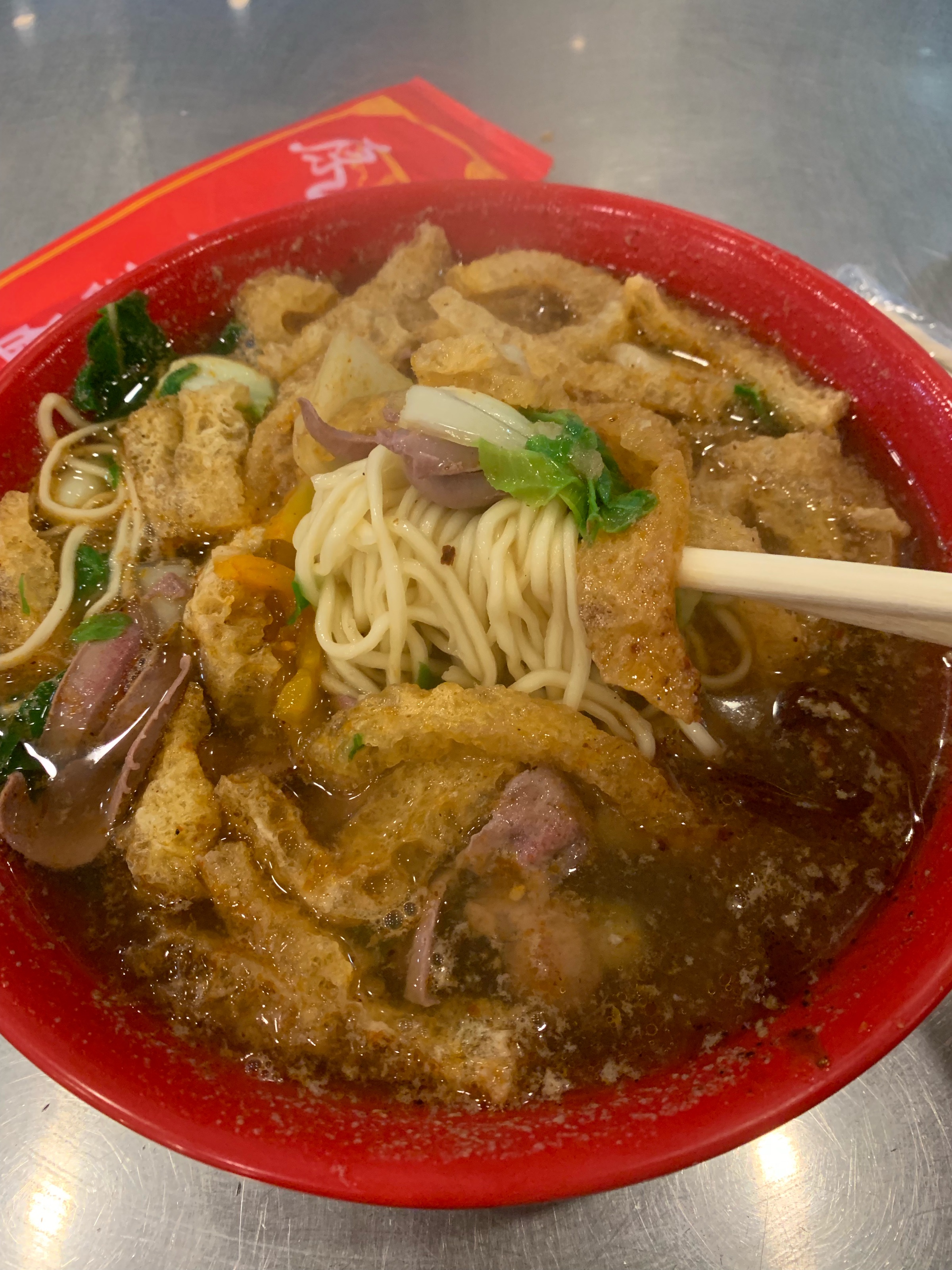 从新街口出来步行前往易记皮肚面。一进门感觉灯光偏暗,装修比较简单,卫生条件很一般。但是味道真挺不错,第一次吃皮肚,爱上了,又有肉的油香味,又多孔吸汁,口感q弹。我还加了腰片,很嫩,处理的很干净,不错。
