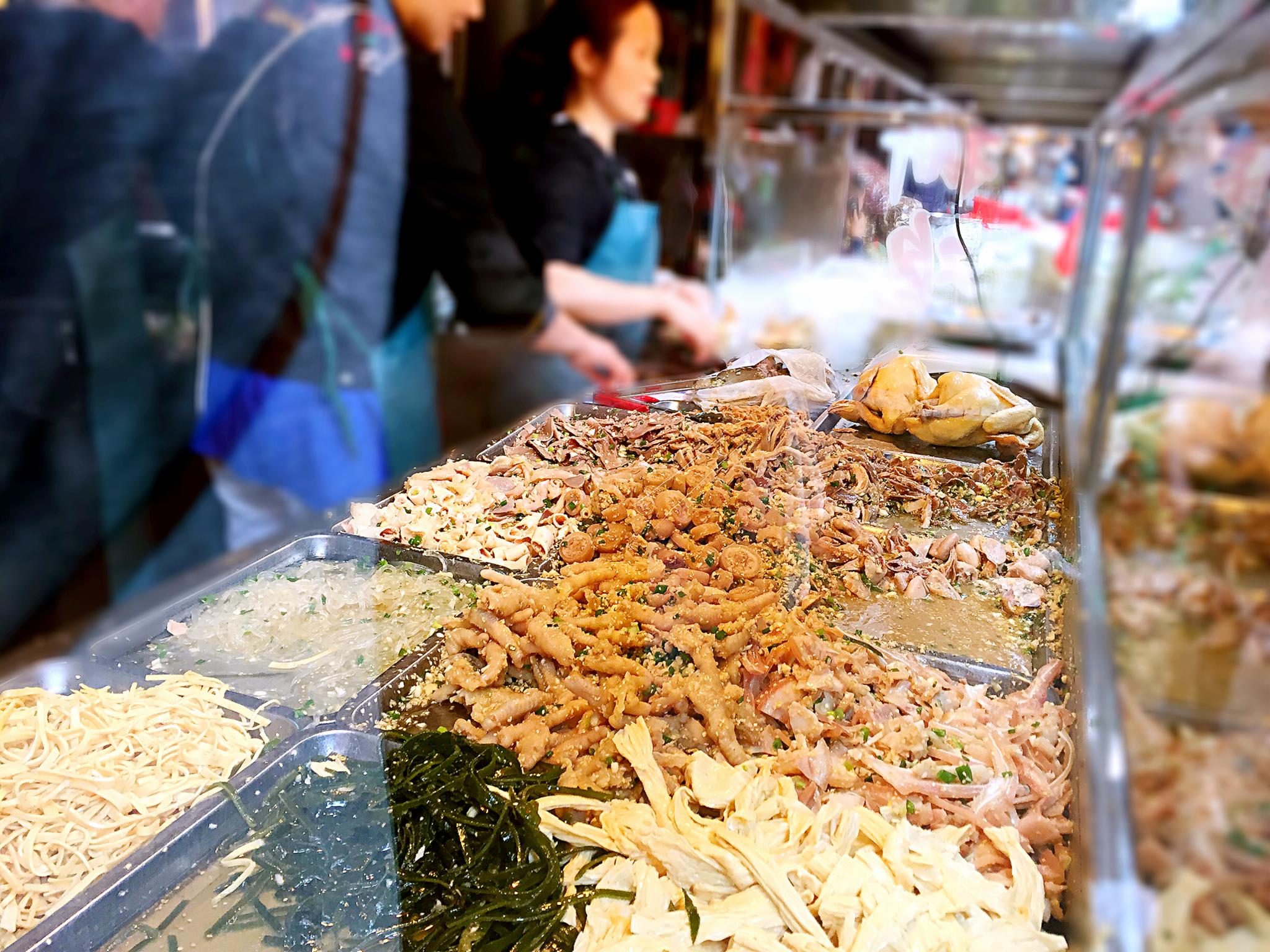 手撕鸡的原材料是三黄鸡,清蒸之后用几十种配料搅拌入味,据说这是从老上海学来的手艺。除了手撕鸡,还有鸡肝、鸡脚、鸡翅、鸡肠、鸭腱、猪心管、猪尾、猪肚、猪舌、猪耳、生肠、海带、腐竹、豆干之类的,都很好吃。一份手撕鸡,一份烧酒,就是美好的休闲时光。