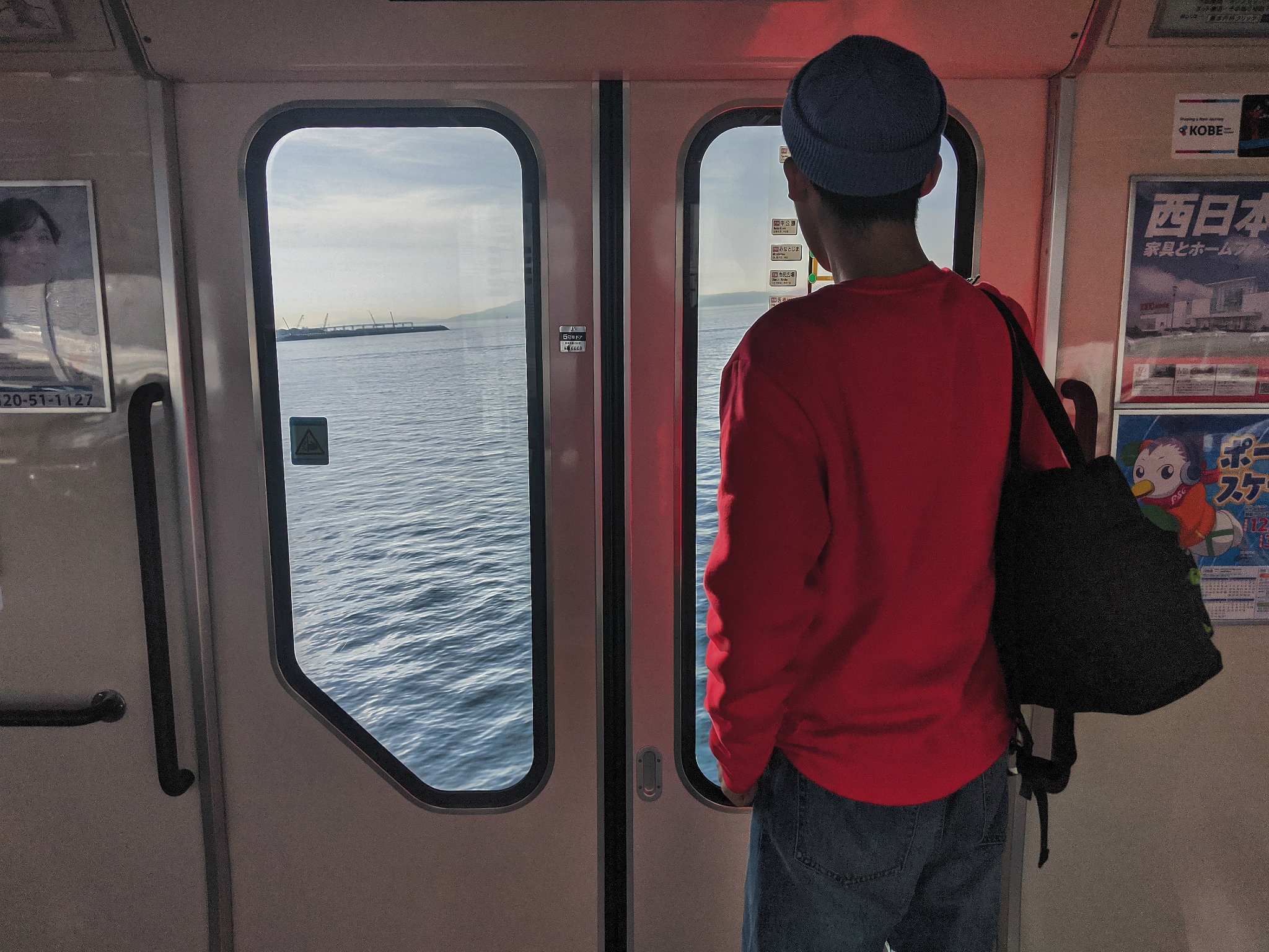 神户机场人非常少,机场线到神户市区的电车从机场开出后会经过一片海域,阳光照耀下波光粼粼。