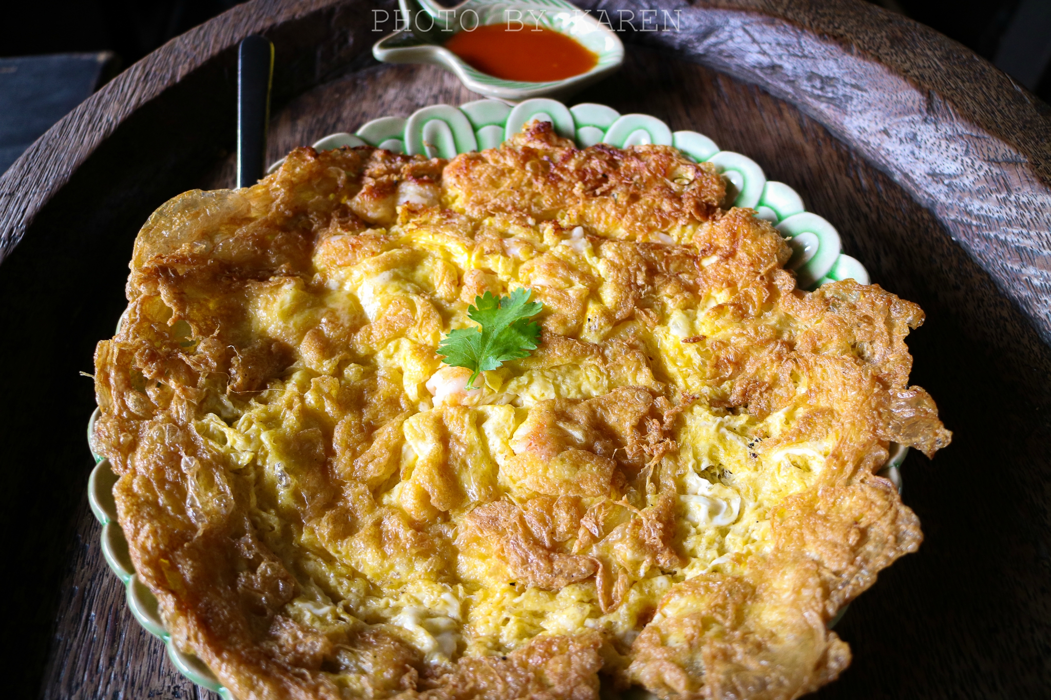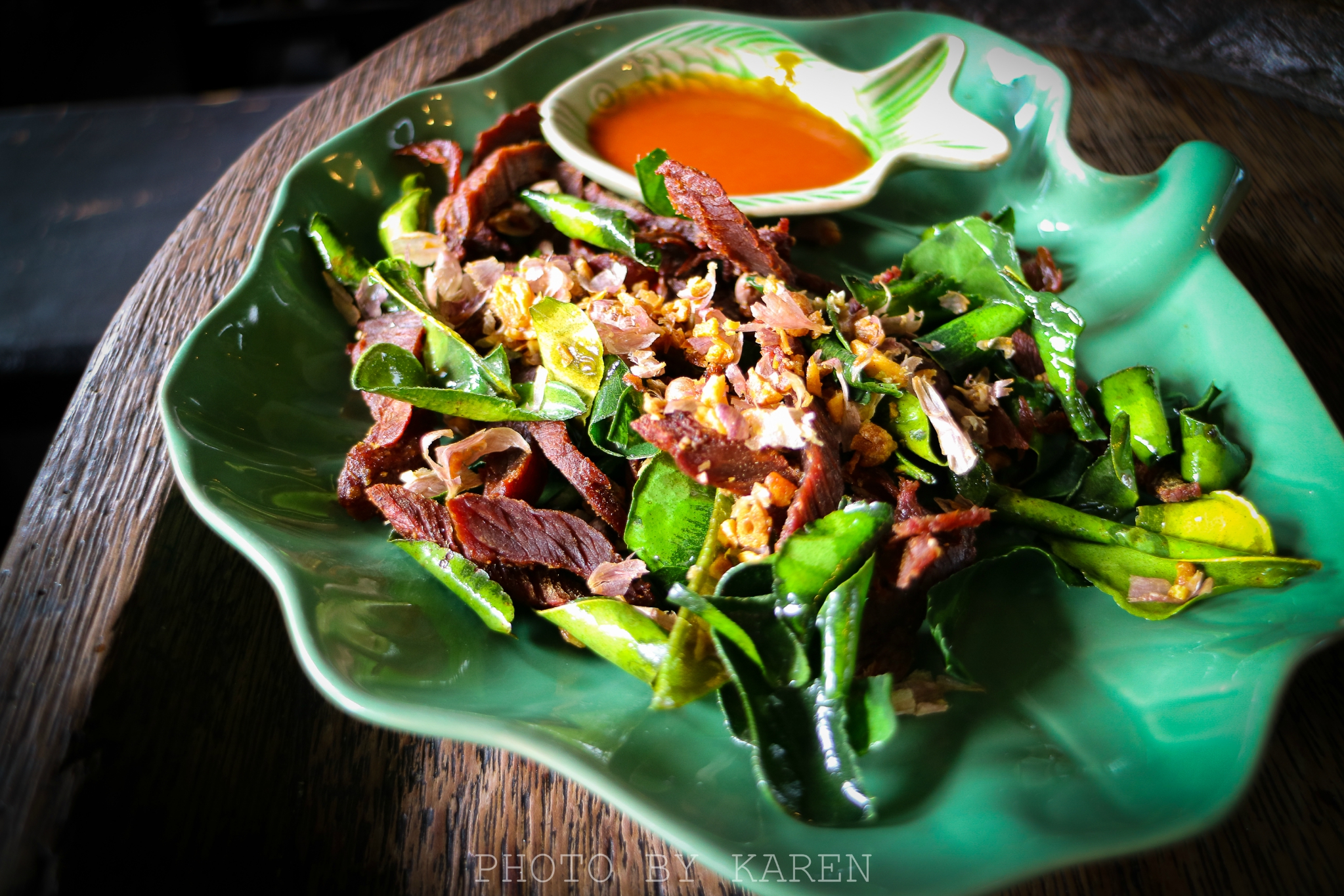 前菜是Ma Hor,光是摆盘的造型就很抢眼。这道算是这家店主打的创意菜了,玻璃杯里面是某种植物的叶子加上肉松、花生、橘子还有叫不出名字的材料,必须是连叶子一口吃下,它的口感非常的有层次。有点怪怪的味道,但还算是那种能吃得下去的。一边的荷叶垫上,配料是用猪肉末、大蒜和花生碎炒在一起放在橘子上的,一口下去同时会感受到甜味和辣味,非常的好吃。中间的锅巴配蘸秘制的辣椒酱,总之这道前菜蛮特别的。