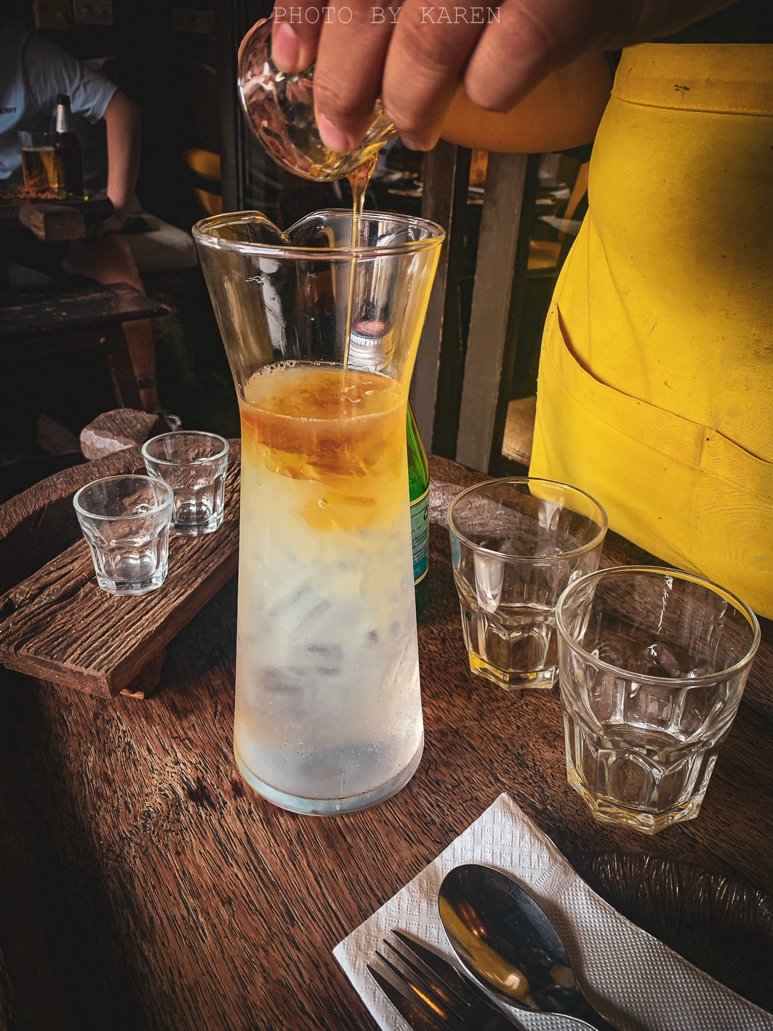 这道炸牛肉,居然是脆的,里面的配菜某植物叶子,就好像在吃薯片一样。配上特质的甜辣酱,味道还不错,算是这家特色的创意菜之一。而虾仁煎蛋,味道就中规中矩,不过虾仁用料很足。蜂蜜苏打水,算是饮品中的必点了!造型满分~适合2-3人的量,由服务员来调配,将柠檬汁、蜂蜜、苏打水、圣培露和冰块一同混合搅拌。酸酸甜甜,清新解暑,柠檬味超浓郁。