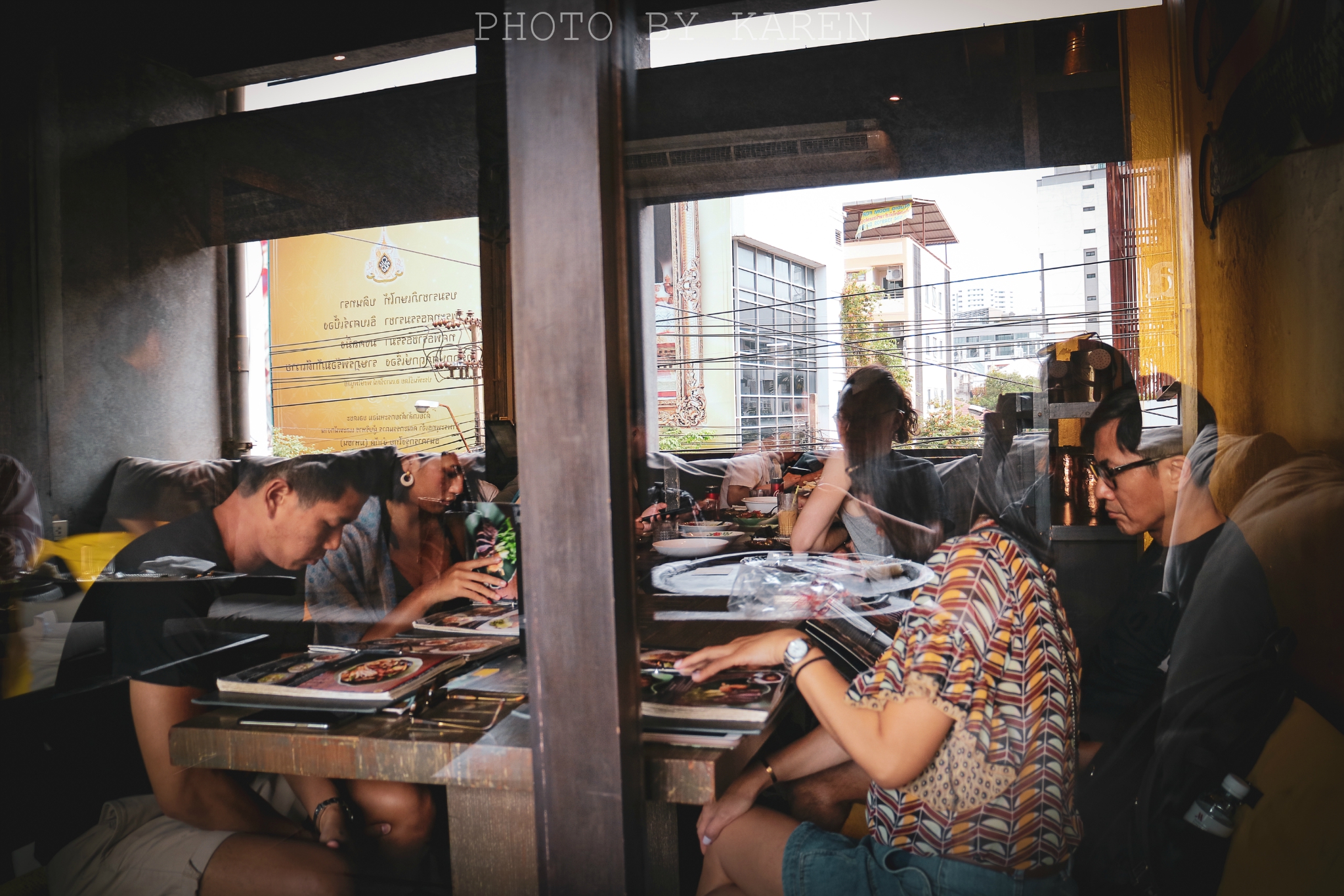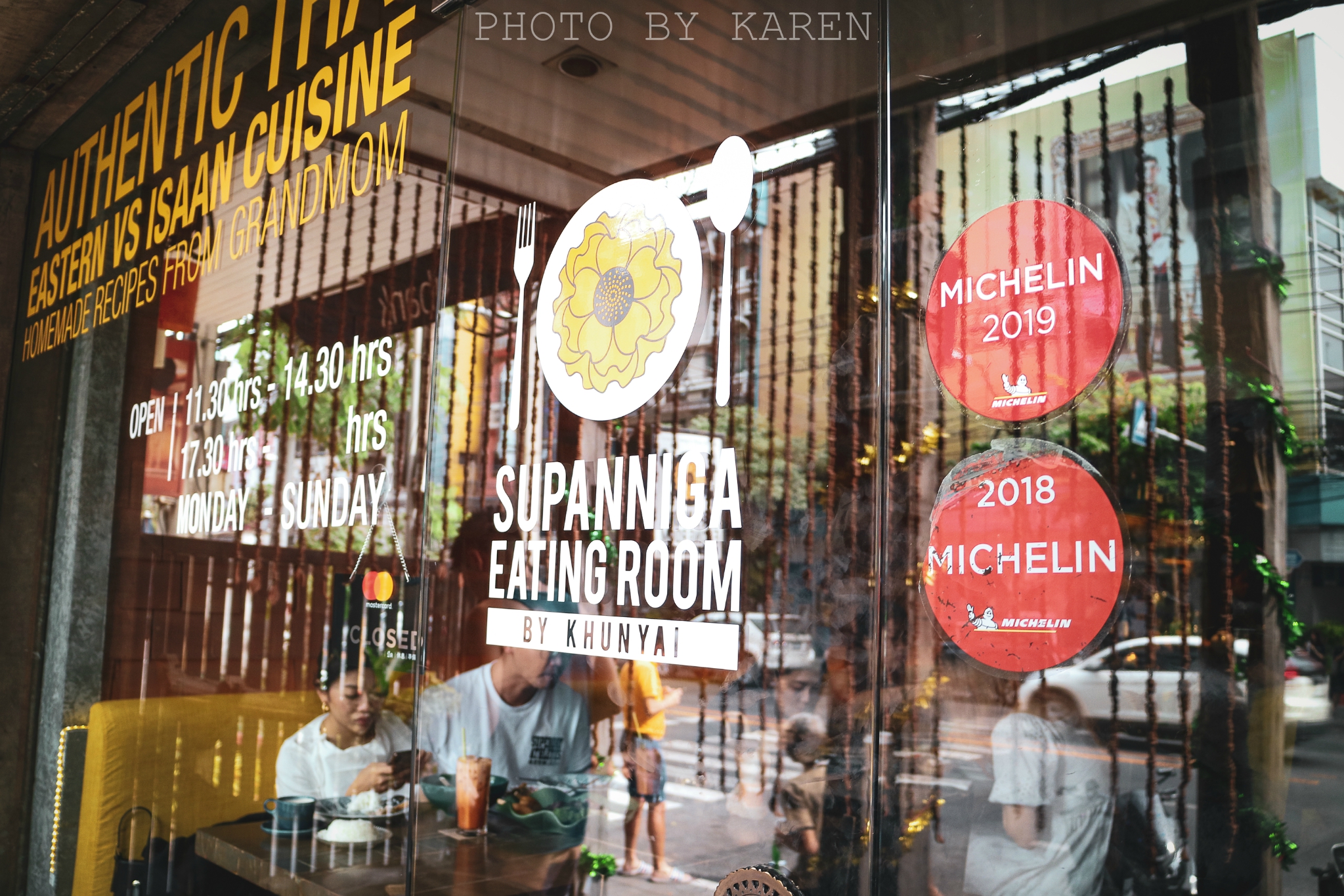 Supanniga,是我们无意间搜到的一家米其林餐厅。坐落在Thonglor某条巷子里,一共三层的独栋木屋。由于我们没有提前预约,先被服务生拒了,告诉他可以等才勉强让我们在门口等候。进入餐厅内部,木质风格搭配暖黄色调,简洁治愈又不失逼格。一楼空间较小,二楼则更大也相对更私人一点,由于位置紧俏,服务生直接把我们带到了二楼的小阳台。