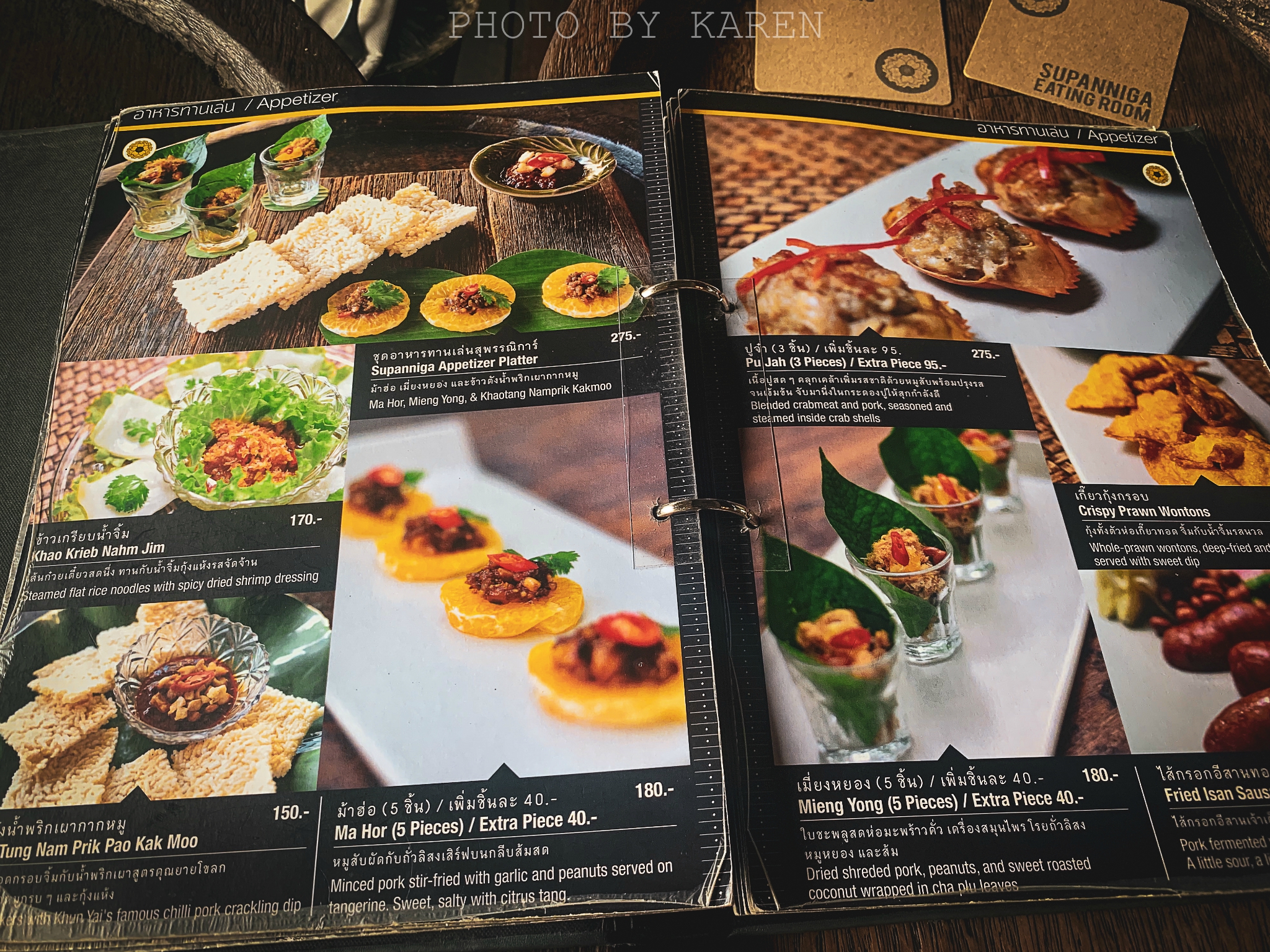 菜单只有泰文和英文,店员会简单的中文,照推荐来点餐基本没问题。据说这家的主厨团队在对泰式传统菜肴的基础上,加了很多创新。一看菜单就知道这家主打创意菜式,是很精致的泰式料理!