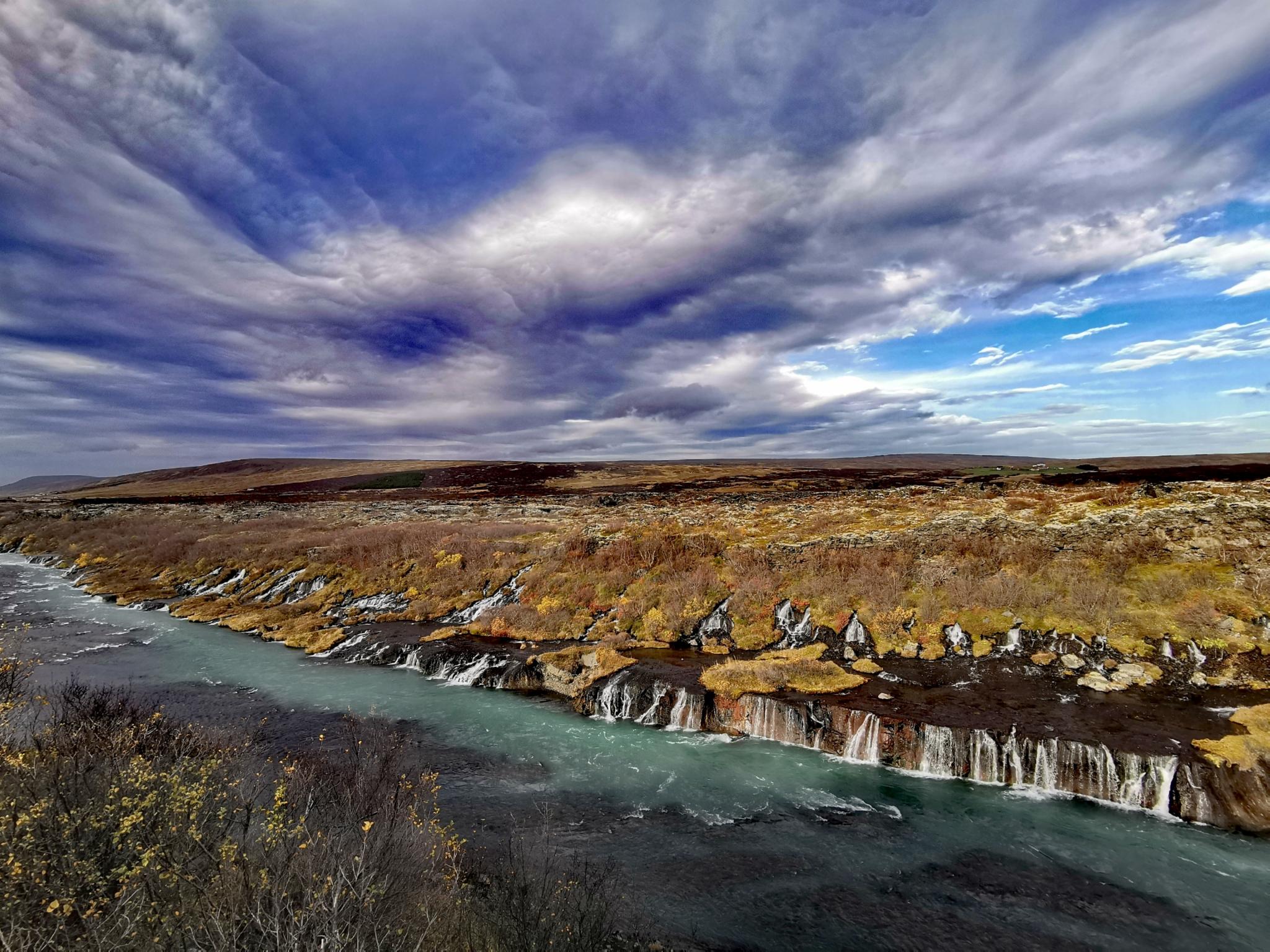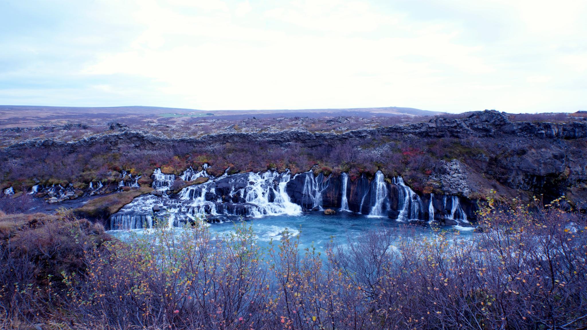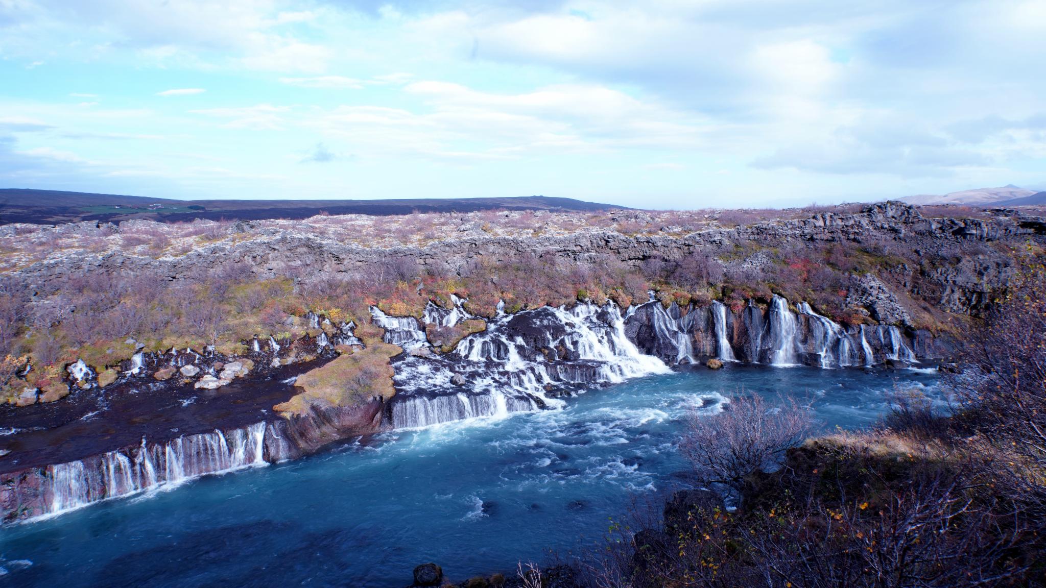 从Barnafossar Waterfall沿着小路走不了多久,就能到达赫伦瀑布(Hraunfossar Waterfall)。