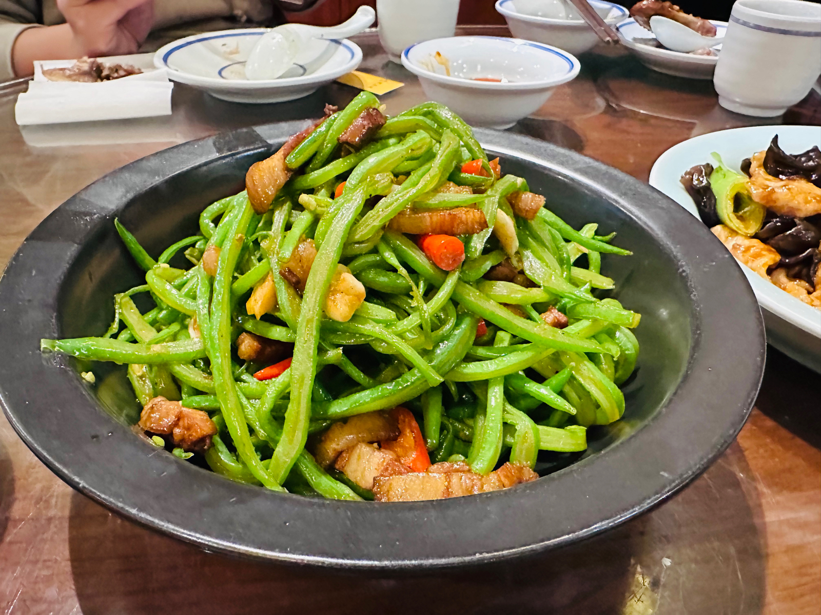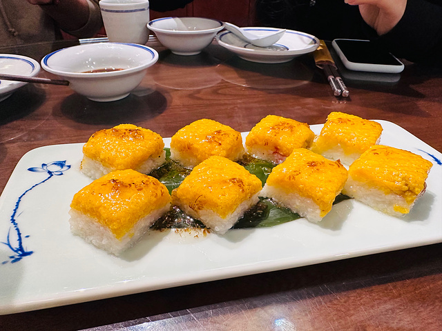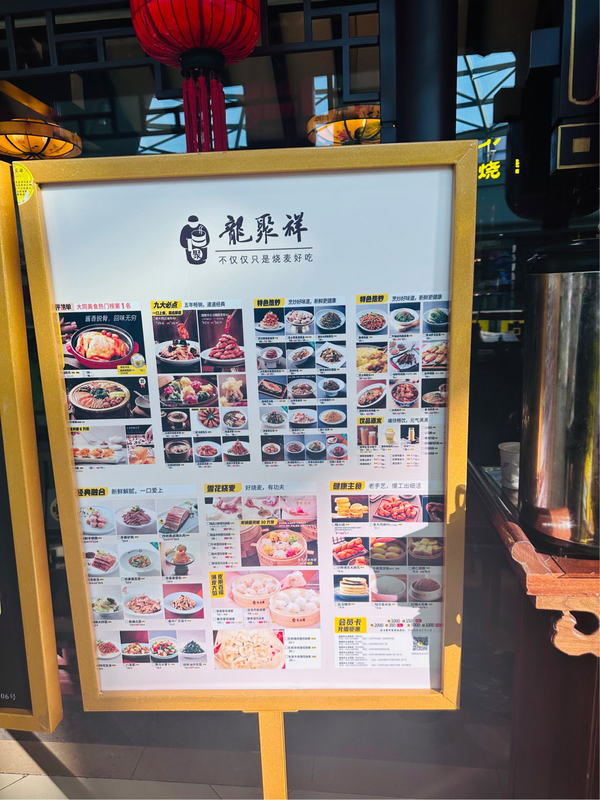 大同很多餐厅🍴下午是休息的,周边搜了一圈🔍发现这家还在营业,而且正好也想尝尝烧麦,于是直奔这里。 🍃环境: 虽然已经过了午饭高峰期,但是店里的客人依然还不少。餐厅是古风建筑风格,装潢的很有感觉。店面很大,摆放了很多桌子,可以容纳很多客人。或许是太红火,也或许是服务员太忙的缘故,店里的卫生确实不敢恭维,我们入座的圆桌下方很多上一拨客人剩下的垃圾,一直没有人清扫,只好自己拿笤帚🧹去来清理。 💁服务: 服务员都比较忙碌,服务上有些跟不上,清扫🧹、点菜、结账🧾等等都需要催促或者等待⌛️,估计是因为过节期间,希望之后可以改善。 🍜菜品: 来烧麦馆,烧麦自然是必点,大家都要尝尝,于是选了精品羊肉雪花烧麦和牛肉雪花烧麦,皮薄馅多,蘸上料汁味道不错;王府密制鸡半只是网友推荐的,不是我们只点了半只,而是这道菜就是半只份,这样也好,不会浪费,鸡皮烤的焦脆口感很不错,份量适中;老大同过油肉的里脊肉很嫩,不过确实油比较多,减肥人士要谨慎;香炒大同鲜黄花和干锅咸肉扁豆角其实本身是当素菜点的,份量适中,油也比较多;来大同,自然还是要来个浑源凉粉尝尝,凉粉本身味道一般,配料还不错,整体酸辣口味。 📍位置&交通: 万达广场4层,周边公交车🚌很多,自驾🚗也很方便,万达广场地下有很大的停车场🅿️。