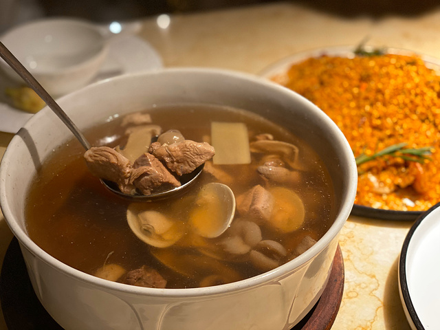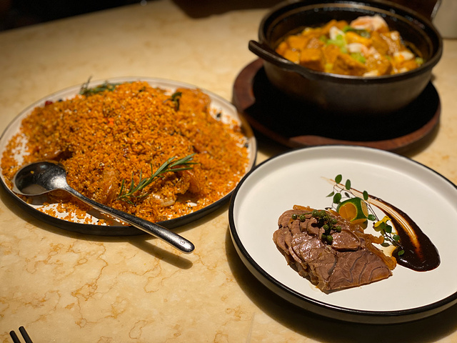 一开始朋友说要来这里聚餐我是拒绝的,因为真的太远了!以至于我到餐厅门口的时候都想不起拿手机拍照。但是走进去就觉得环境挺好的,座位宽敞,而且挺舒服。 我们一行四姐妹,胡乱点了几个菜,其实挺担心踩坑的,但是没想到(下面我要开始夸了) 金汁黑豆腐真的力荐!豆腐表皮有点皱皱的不起眼,但是咬开内里很嫩,搭配浓浓的咖喱酱,简直是下饭神奇!给我一份我能吃两碗白米饭!秘制大肠表皮很酥脆,很香!汤很鲜甜,喝起来就感觉很滋补。 整体来说还是挺好吃的,就是远🙈