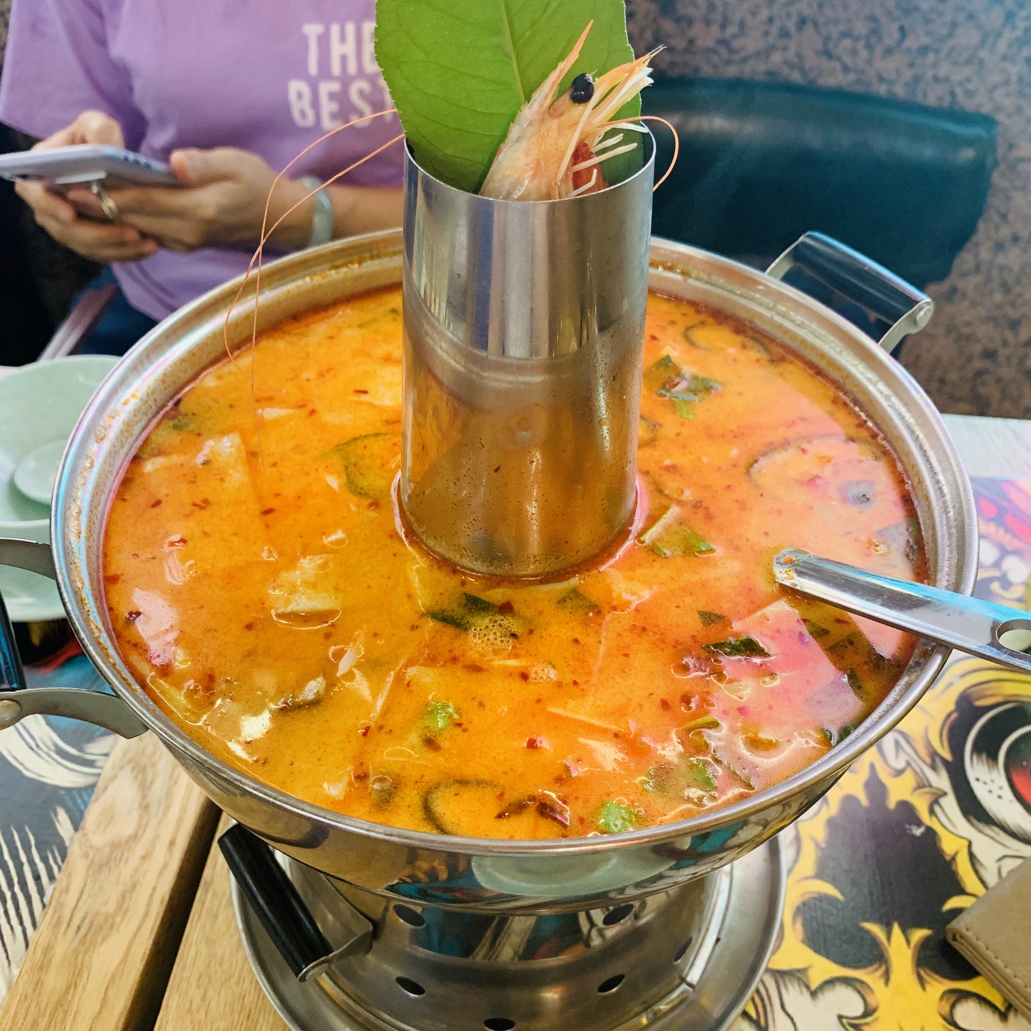 【泰国冬阴功海鲜汤】不会很辣,辣味刚好,偏咸一点,不够酸,非常多料,虾啊贝类很多,汤超级多,完全喝不完,只能打包
