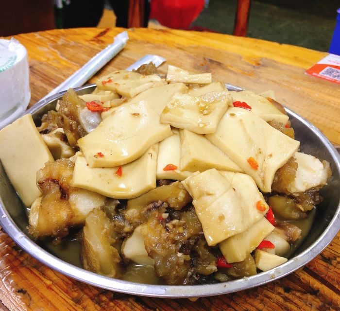 店里来的老熟客,进门就会跟老板说:来一份牛蹄豆腐,加辣。千页豆腐很入味又带有一点弹性,牛蹄一份有三个左右,炖得很烂很入味,软糯Q弹,一口下去满满的胶原蛋白。