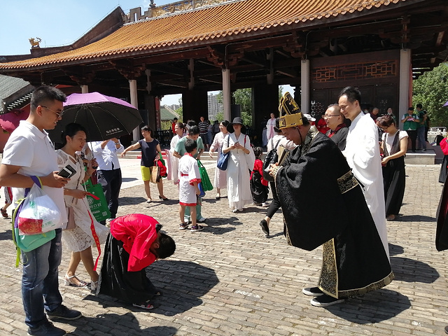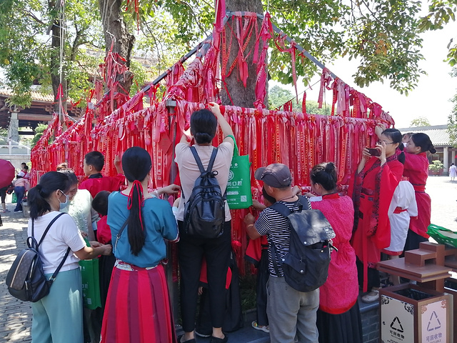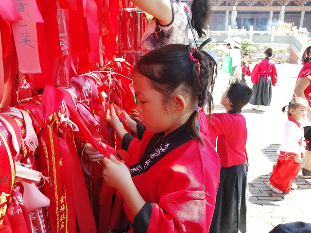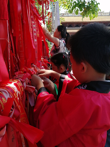 学童们和家长一起来到大成殿广场,家长拿起自己孩子的许愿带,陪同孩子把许愿带系挂在孔庙的许愿树上,自此