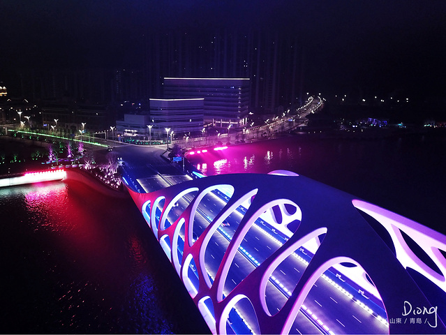 这座桥整体是白色的,像是一块晶莹的珊瑚卧在海面上,晚上时候会特别美,入夜之后,整座桥都会亮灯,而且是五彩斑斓的颜色随时在变换,所以晚上来欣赏贝壳桥的话,会更绚丽好看一些,光是站在岸边看都会觉得很美,可惜是晚上天色比较暗,不太容易拍人像。