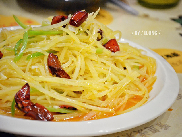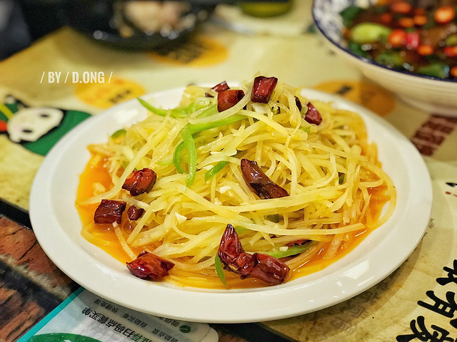 🥓水煮肉片 装的满满一盆的水煮肉片, 看一眼就感觉分量真的太实在, 辣油飘着一整层,但是辣度比较轻微, 主要是肉片的嫩滑口感印象深刻, 裹着辣油,很值得仔细品味。 🥔酸辣土豆丝 最家常的酸辣土豆丝, 简约不简单竟然还是口碑款, 每一根土豆丝都是很入味的感觉, 酸味和辣味的比例真的刚刚好, 就刚好是开胃又下饭的口味。