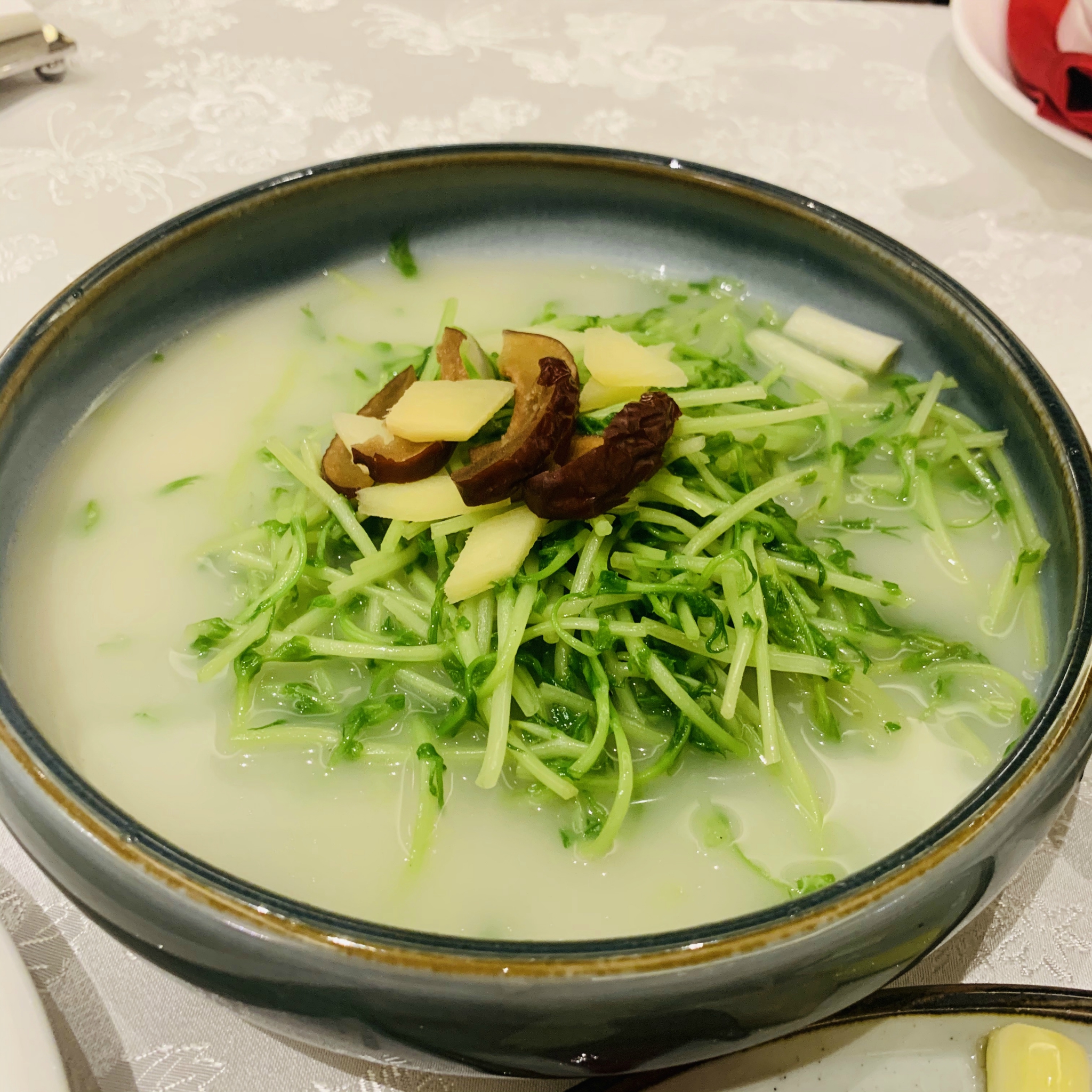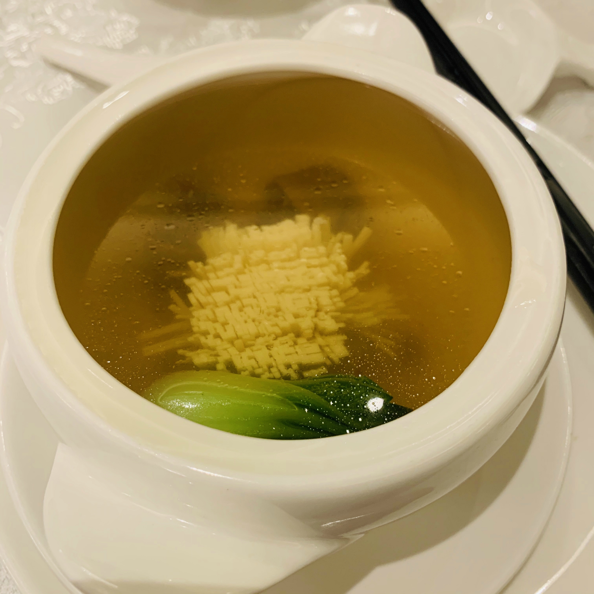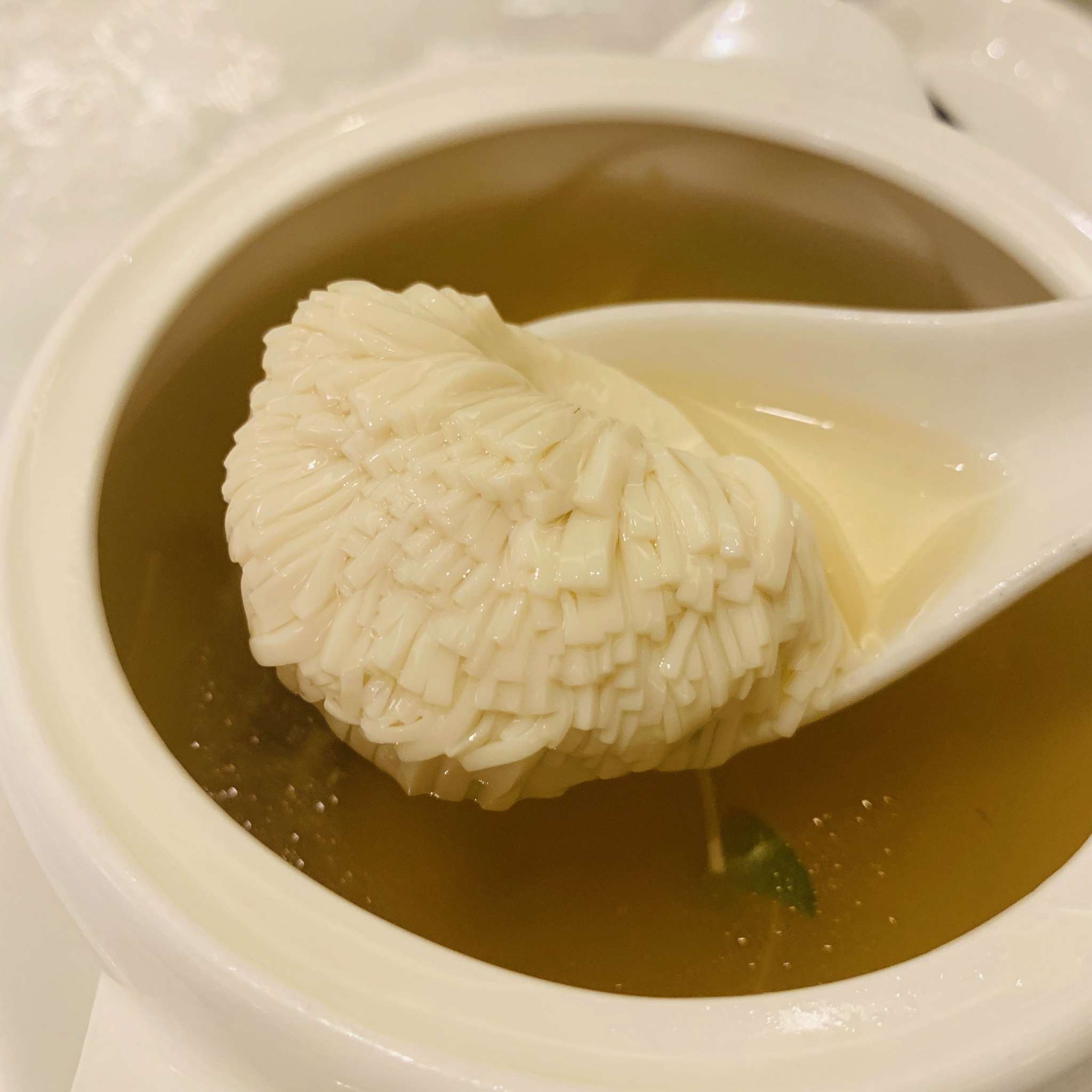 【姬松茸炖绣球】绣球其实就是豆腐,刀工很好切得像花一样,汤味道鲜美,料也挺多,太大碗了,喝汤都很饱