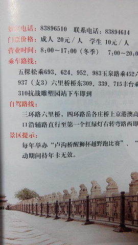 【交通】公交车有很多趟都经过,最近的公交站名是卢沟新桥站, 下车后再步行大约10分钟到景区。 【景区印象】卢沟桥的狮子最有名,惟妙惟肖,栩栩如生。仔细看起来真的很有趣, 都是不一样的表情。那些背着小狮子的母狮子很值得细看。尤显雕刻技艺高超。 【特色】抗战雕塑园、宛平城城墙、卢沟桥、仿古街、抗日战争纪念馆等 【价格】门票在景点直接购买成人价20元,相对偏高。人不多,景色不错。 【支付技巧】可以网上购买年票。这样以后就可以凭票免费进入了