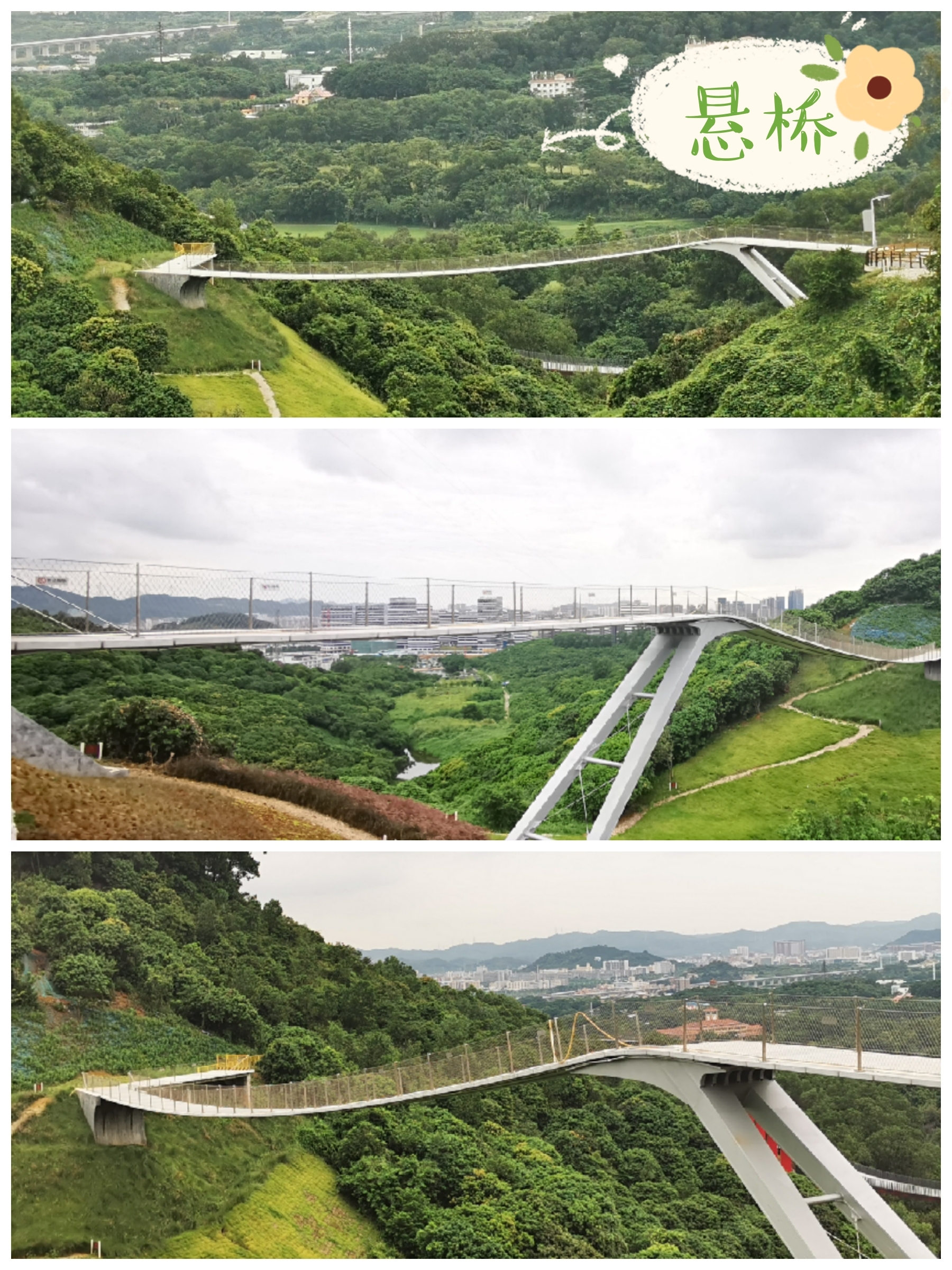 🌈【悬桥】连接两座山之间,桥长90米、桥面距谷底约30米,是一处远眺水库、近观自然风光的观赏平台。大顶岭绿道把网红三桥以及沿途的花海、水库、森林等风景串联在一起。漫步于浮桥或绿道上,享受其中。