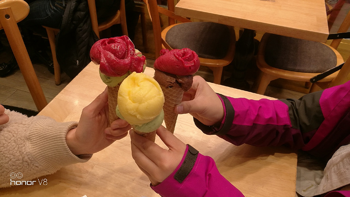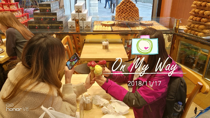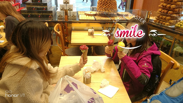 从彩虹阶梯穿越小胡同来到了独立大街。 独立大街是伊斯坦布尔最大的步行街,商场、饭店林立。我们才过来,还没到中午饭点儿,就决定先吃个冰激凌。 没有选择那种逗人的土耳其冰激凌,在安塔利亚景点吃过,可能是景点的摊位吧,不是太好吃。选的这家——MADO。这家是土耳其全国连锁冰激凌店。虽然比别的要贵,但是也确实是好吃,并且标准统一。 有非常多的口味可以选择。开心果味是推荐最多的,味道不是很甜,奶味重,不过没太吃出来开心果味。蔓越梅味的不推荐,太酸了。巧克力的还行,不甜也不苦,正好。我喜欢吃香草味的,奶味足。每个筒可以放两个球,可以多尝一个味儿。 好吃!
