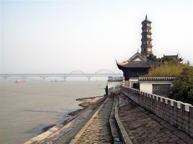 附近游览了立于一角湖面上的仿古的烟水亭;江边就能眺望。外观附近老街内的能仁寺(10元)