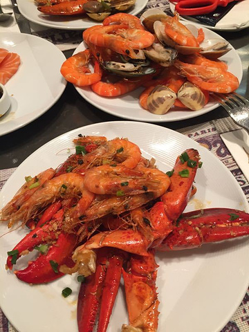 我去那天可能是台风天,没什么人!可以提早入座,但是刚好是早餐和午餐更换时间,所以迟了几分钟才能拿东西吃,不过东西还挺多的,最好吃是蟹钳和刺身和甜品和水果!听说水果是进口的,绿色的哈密瓜超级甜超好次!再过两个月再去吃!而且没的菜式会及时补上,不过吃不到!所以值得去吃!