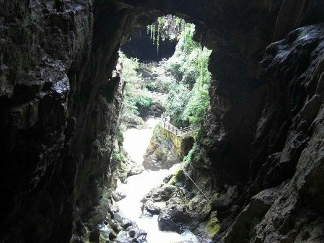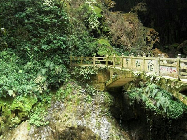 ...溶洞去,需要步行穿行于数百米长的惊魂峡后,此峡水流较大,步行道位于峡边,洞口建有一石桥可观峡谷