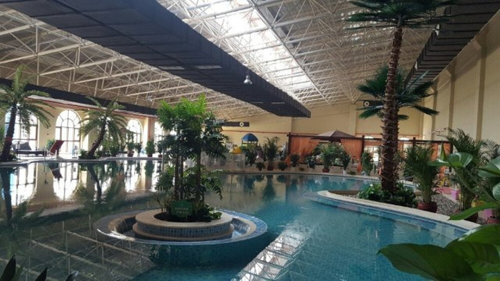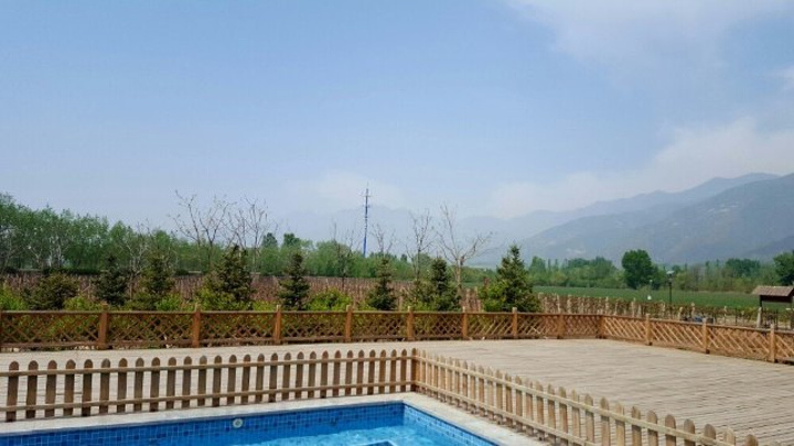 忍人比较少开业一周年不是很大分室内室外清洁程度还可以。室外对着葡萄园和大山室内有个儿童池有滑梯海洋球不是很大。有石板房,有饮水机不提供茶歇但是可以自带点吃的。人少时提供桌餐按人数上周末吃饭自助有休息厅。