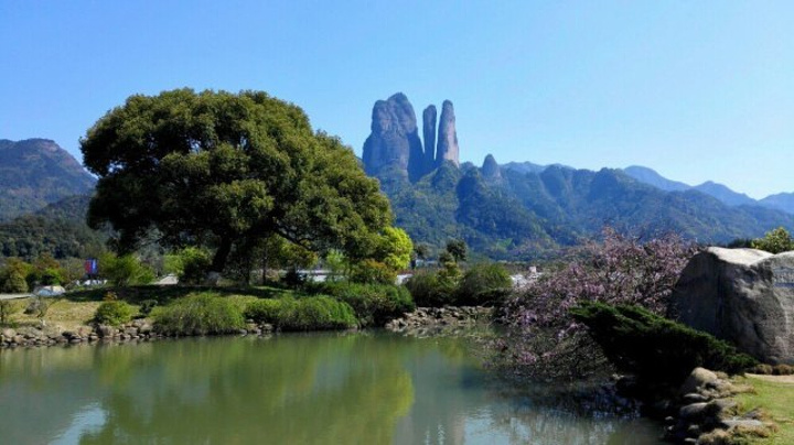位於浙江衢州江山市石門鎮境內的江郎山景區,是國家級重點風景名勝區和國家AAAA級景區,整個由三爿石、十八曲、塔山、牛鼻峰、須女湖和仙居寺等部分組成,面積11.86平方公里,景源類型以自然景觀為主,同時也具有豐富的人文景觀。江郎山山形的主體為三個拔地而起、高聳入雲的巨石,高約360餘米。巨石形似石筍天柱,狀如刀砍斧劈,自北向南呈川字型排列,依次為朗峰、亞峰、靈峰,人稱“三爿石”,亦被中外遊客譽為“神州丹霞第一峰”。2010年8月,作為“中國丹霞”的系列提名地之一,江郎山被列入世界自然遺產名錄。