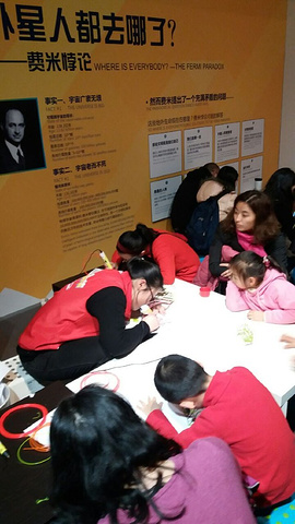 就在环球金融中心的四楼,东泰路可以直接进来,,规模还是挺大的,现在有团购票,价格也比较实惠,人很多,最后有一个三维立体手工四十块钱,带小朋友,基本上都赖着不肯走,有时间的话就出来看看也不错,不过值得注意的是,陆家嘴这里停车不大方便,从坐地铁的话即便过来都有点远,还行。不过这里吃喝玩乐的地方很多,有时间过来看看也不错。这里讲授宇宙起源的动画,非常的直观,有把宇宙的历史浓缩到一年,讲生命的起源几乎是发生在最后的几天,给你的印象非常的深刻。各种火箭的模型也比科技馆的要直观一些。科技馆是用实物,而这里是用动画的形式。