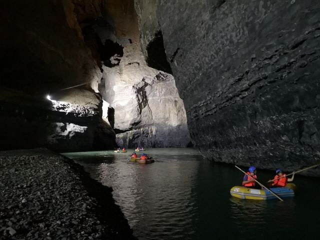 当地人说水大漂不了水少也漂不了而我们去的时候刚刚好,原先因为人少不想漂,后来来了一个十人的小团队,说好和她们一起漂。上漂流起点的车票16元,穿好衣服带好安全帽出发,前三分之一水面比较宽平要用竹竿慢慢划,到了中间三分之一水流急落差大,一个浪接一个浪打过来全身湿透,这段应该最惊险,最后三分之一漂进黄金洞地心,开始水流也很急,被水冲到边上两个人用力划了两次还是被冲回去,最后用竹竿顶着才顺利回到原路,洞很大顶高洞宽,里面有救生人员。一共漂了三个多小时,上岸后在售票处旁的卫生间还有洗澡的地方。整个游玩真的不错,推荐推荐