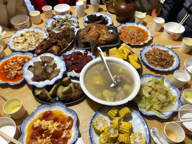 一大桌子非常丰盛,不够还可以加,还有青稞酒任你喝,篝火晚会气氛非常好,大家都玩的很尽兴,和摩梭...