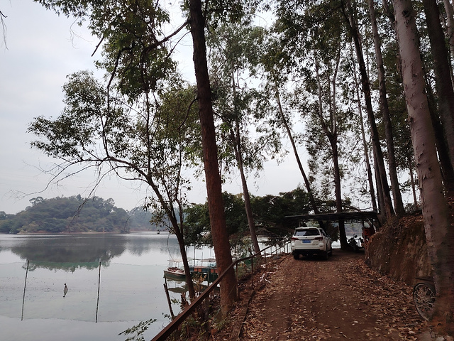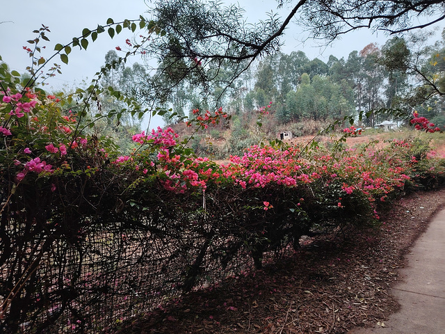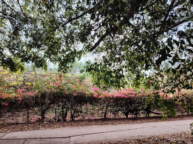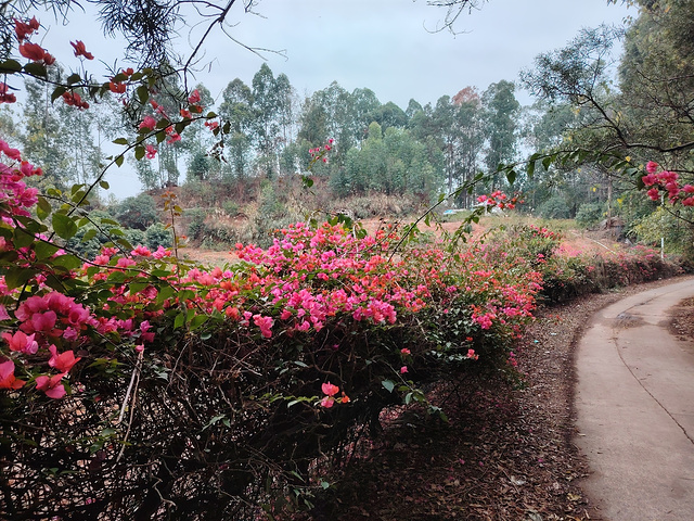 春天的南宁,三角梅盛放,到处都看得到。 这一片红花是在金沙湖亲水休闲园旁边,从这里到湖边很近,我要坐小船到对面岛上的岭头凰竹盐鸡养殖基地吃饭。