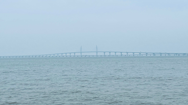 珠海。拱北海边观海。远处港珠澳大桥。 你在网上看到介绍观澳平台都是这样的: 拱北观澳平台:这里是观赏澳门风光的绝佳位置。站在平台上,你可以一览澳门城市的壮丽景色,两岸的独特魅力尽收眼底。无论是白天还是夜晚,这里的景色都别有一番风味。 遗憾的是我们到的时候是阴霾天气,能见度不高。