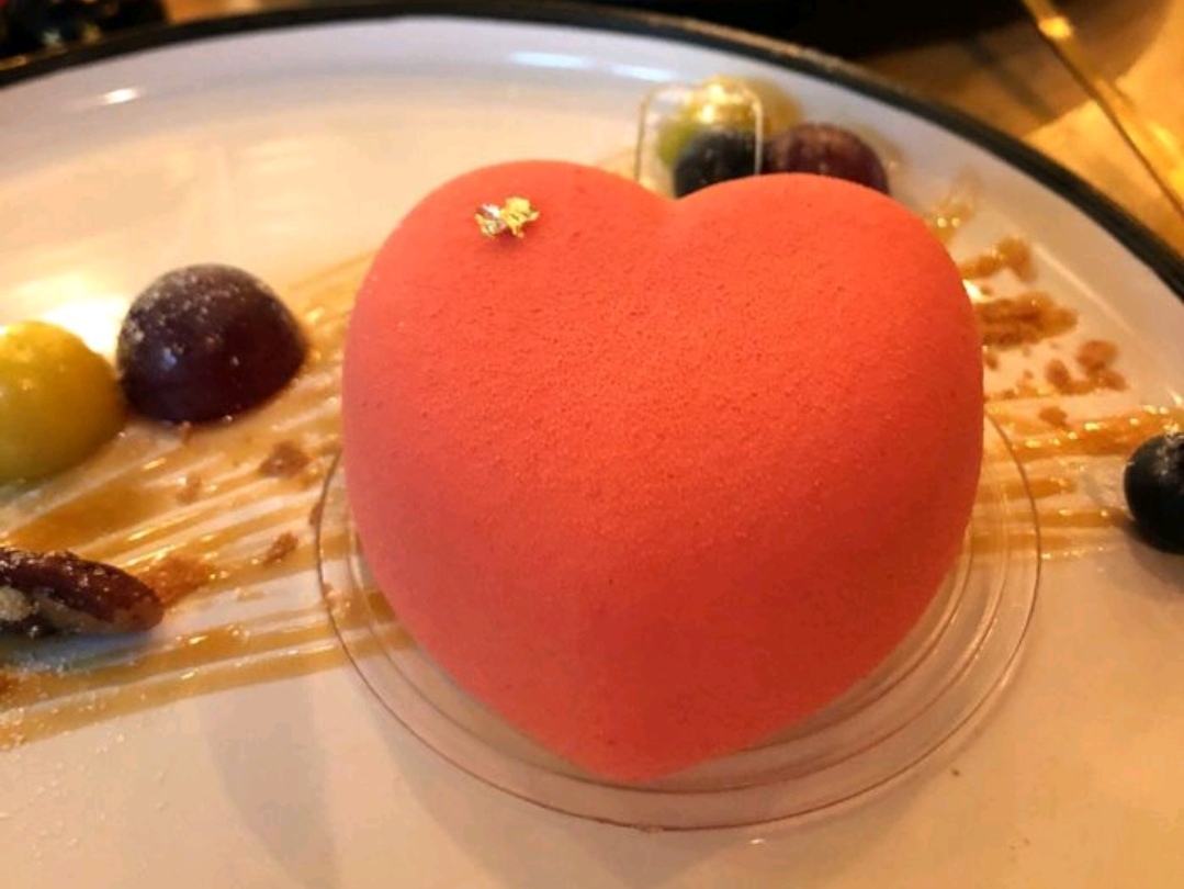 心形百香果慕斯蛋糕外壳是软的 所以没有硬白巧克力的过甜,却能做到比别人家更好的造型。百香果偏酸但层次很好,特别好吃。