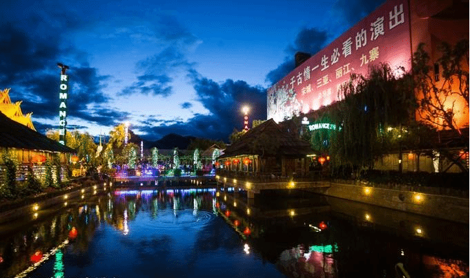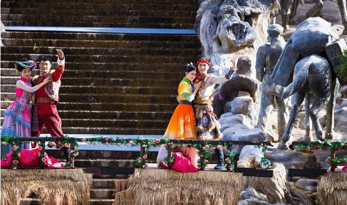 到了千古情景区有两场表演不容错过,一个是最有名的歌舞剧《丽江千古情》,一个是实景演出《丽江恋歌》。有朋友问过我说看过了《丽江千古情》还有必要看《丽江恋歌》么?我说这两个节目完全不是一个风格,每一个都独具特色。恋歌乐园的上演时间是每天的下午六点到六点半,在专门的实景剧场上演,就是下图左下角的位置。