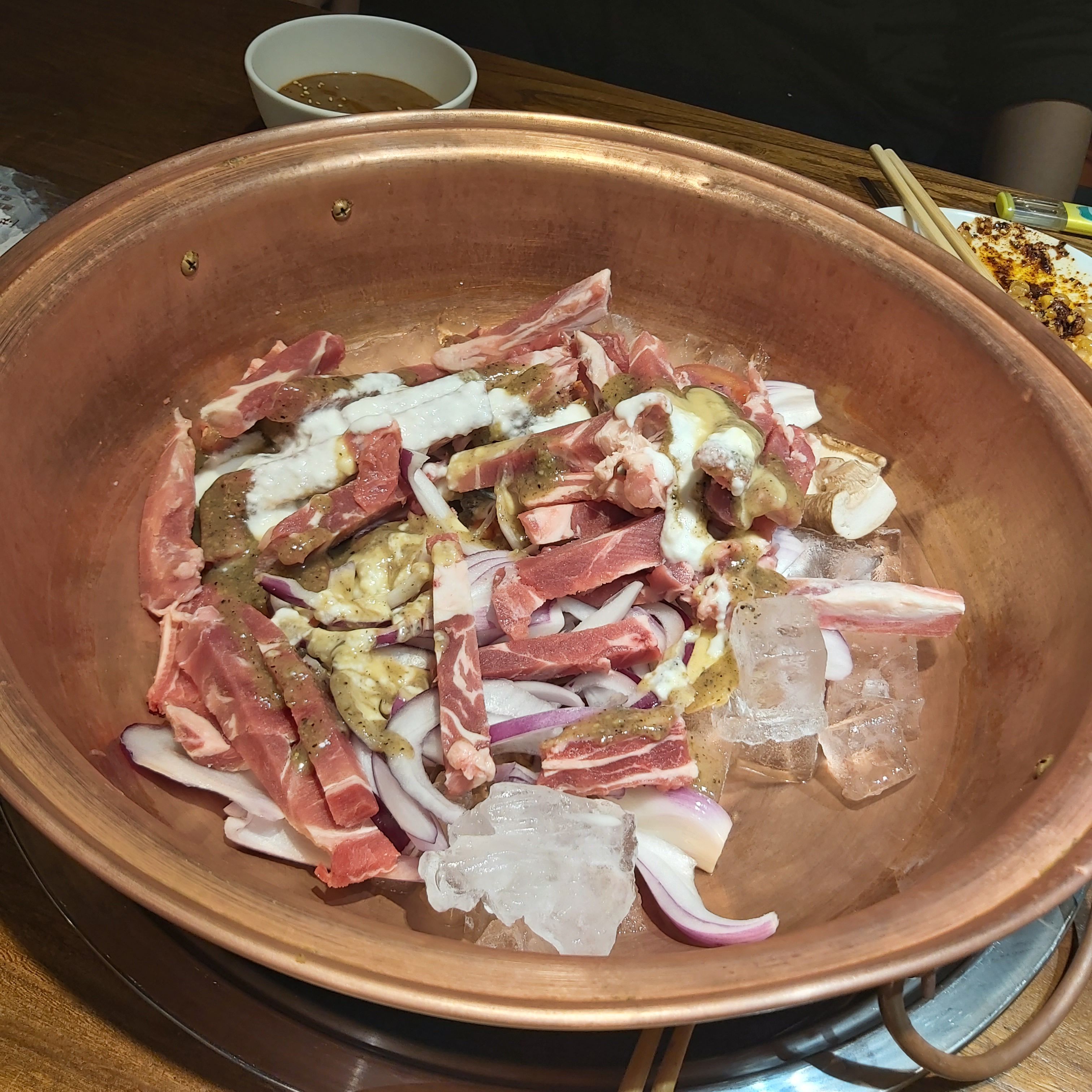 冰煮羊肉的冰是泉水,肉放在冰上,开火冰化了煮羊肉,开锅后半小时羊肉变软,吃完肉后涮菜。牛羊肉是这里的特色,两个人140左右。烤包子不错,肉馅满满,趁热吃脆皮的~