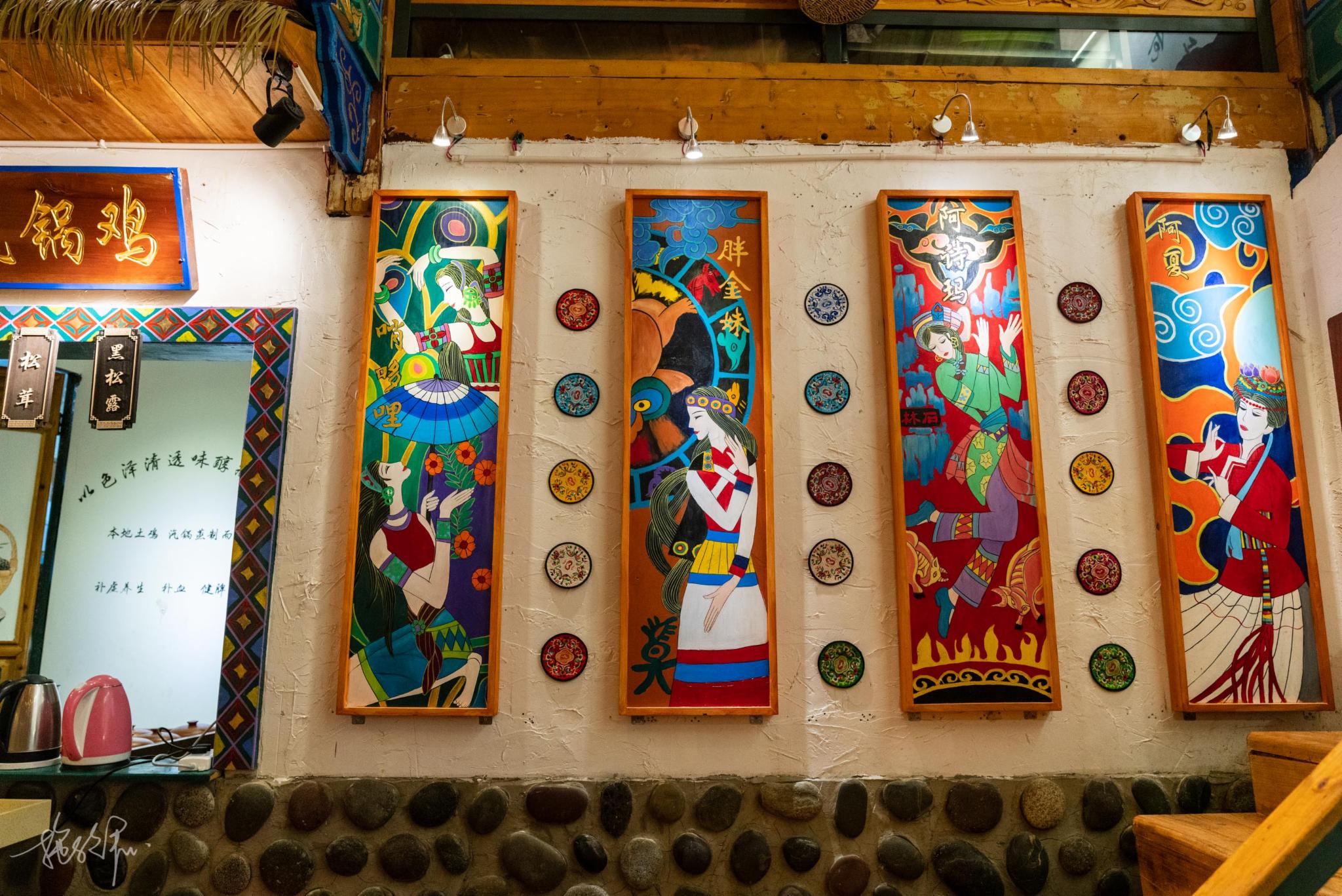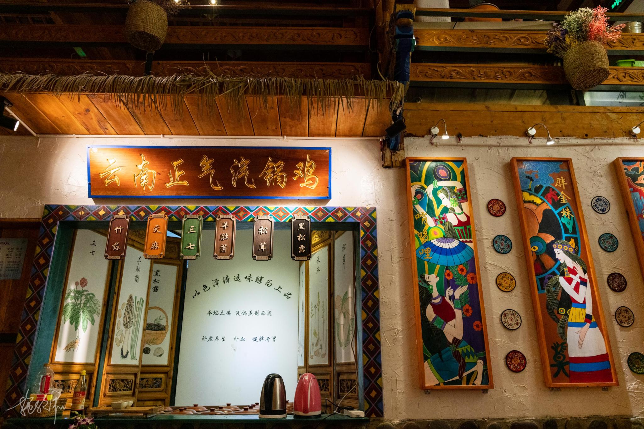 进店以后的墙绘都是古香古色,穿着民族服饰的金花,展示民俗特色的火把节、泼水节等等,都在就餐的环境里看得见。有一个窗口是专门写着“西南正气汽锅鸡”,估计是特色菜,安排。