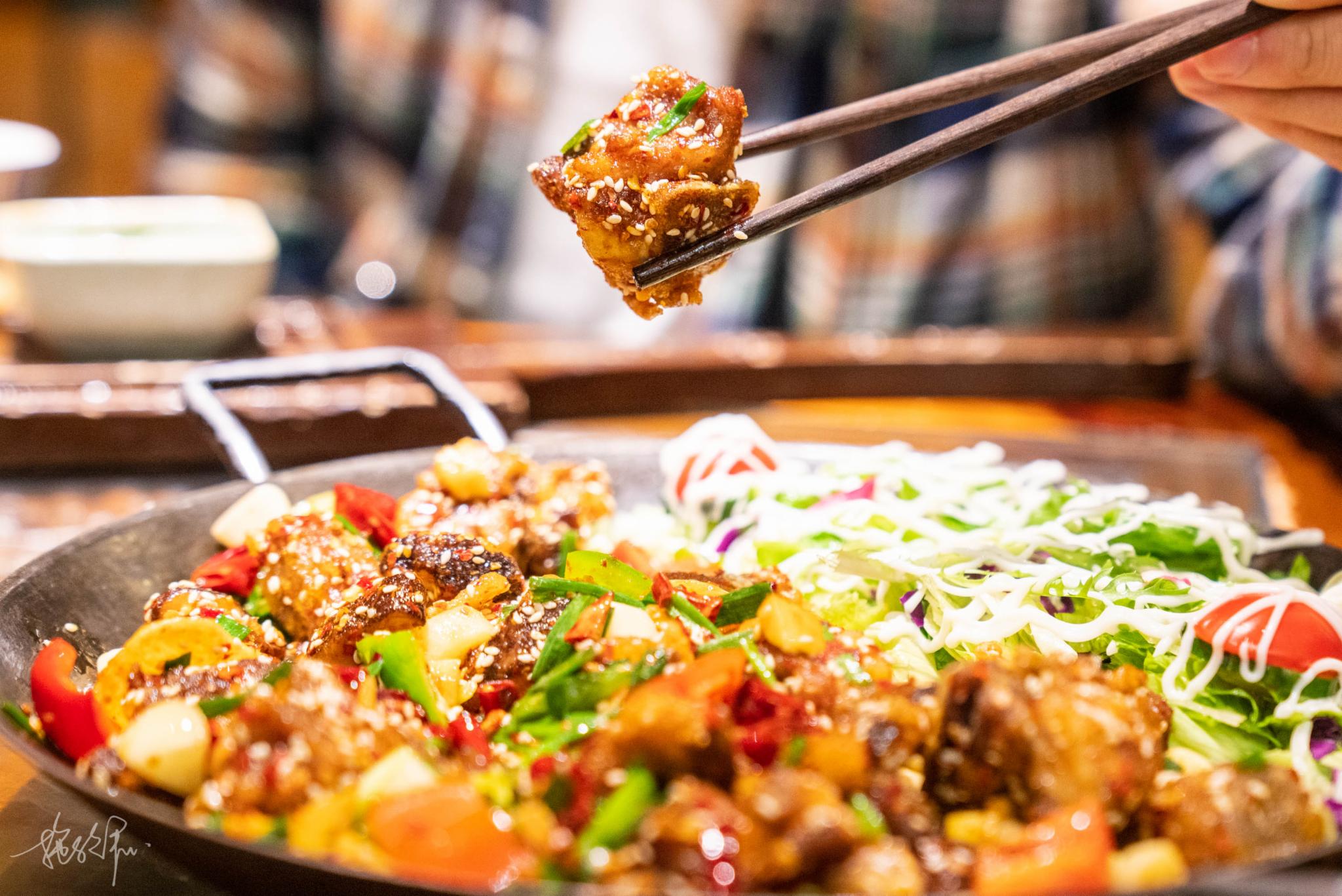 丽江腊排骨,许是站在客人的角度来说,出菜的另一侧是一片蔬菜沙拉,这样的话在吃着排骨的同时也可以解腻。腊排骨是丽江很出名的菜了,吃起来香香脆脆的,这样做一番改良想必更多的人们都能接受,颜色好看,分量也很足。