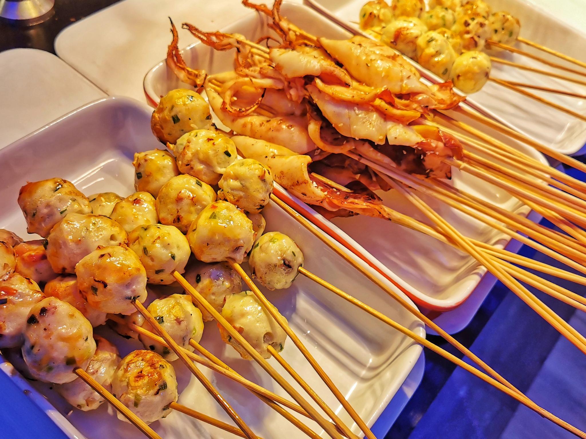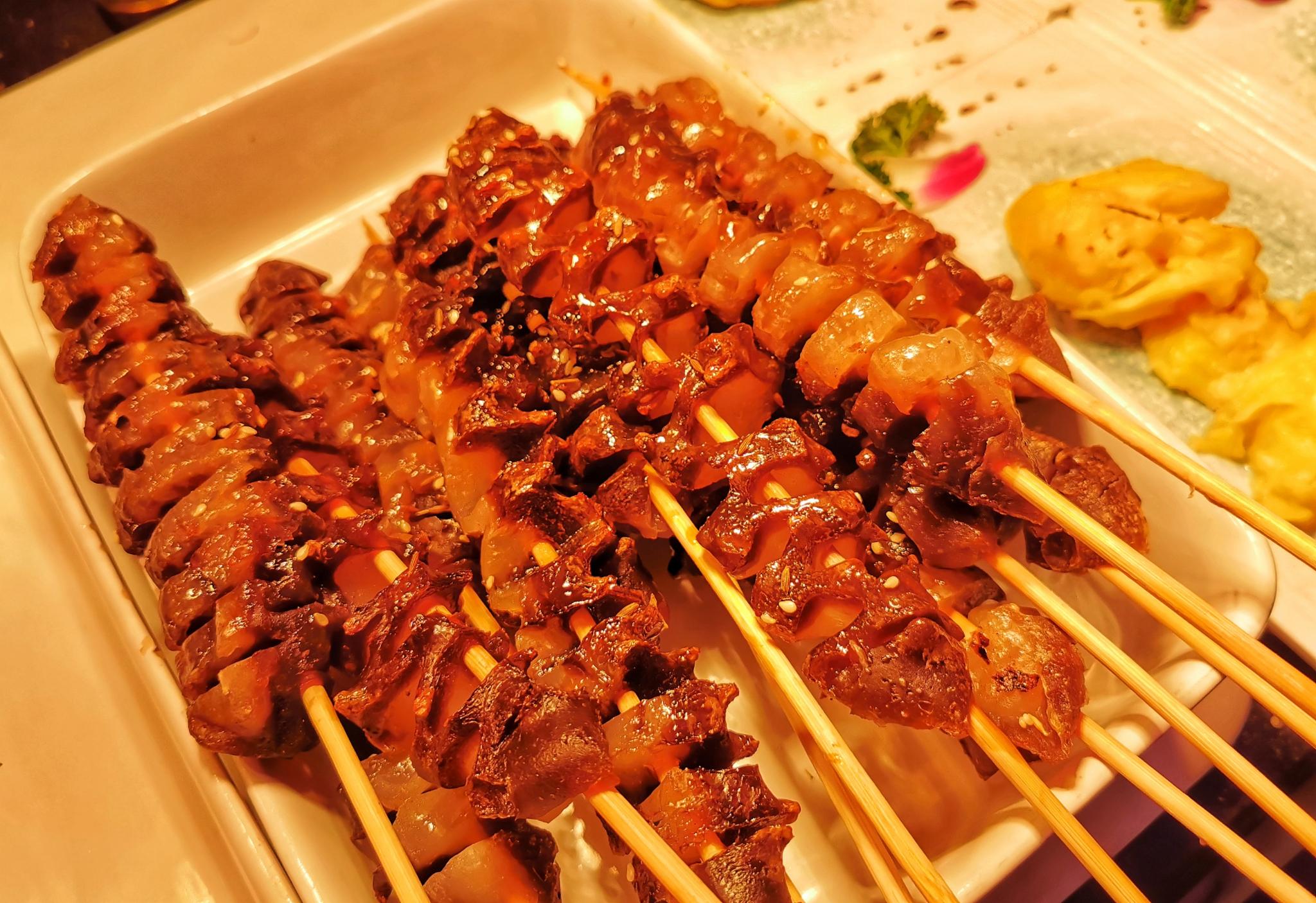 此外,鲍鱼、 阿根廷 大红虾、白牡丹虾刺身、生蚝等各种海鲜任你选。印象比较深的,还有海参像面筋一样串起来烤着吃,别的地方还没见过。