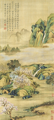 天水成纪博物馆馆藏 钱杜 《春山秀色图轴》此幅山水画轴以细笔为主,精细入微,幽冷疏散,运用金碧青绿法,鲜妍雅丽,所画山石、树木,彩霞环绕,琼芝瑶草,入眼一片明媚春色,超逸脱俗。