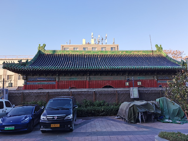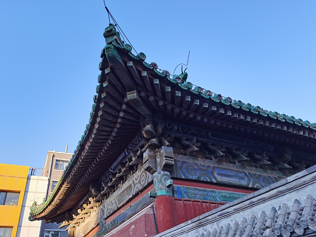 [调皮]朋友推荐的 据说来这能看到金刚殿 [调皮]今天风虽然大但是天气很好 所以特意过来了 [调皮]位置在护国寺街上 在护国新天地的后方 正门在东面 百度地图上显示的是24小时开放 但是过去的时候发现门是关着的 门边上有简介和二维码 可以扫码看介绍 [调皮]大殿后面现在是一家酒店 没好意思进去了 [调皮]拍的时候看到一对中年夫妻过来应该也是特意想来拍的 [调皮]整天如果在附近逛可以顺道来拍拍外观 运气好赶上开门了 可以进去看看 但是单位前来看看不大值当