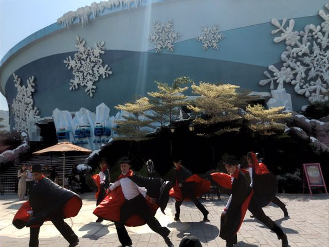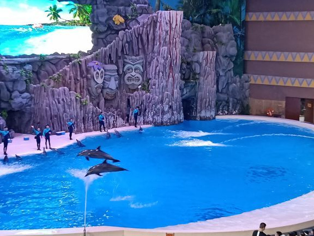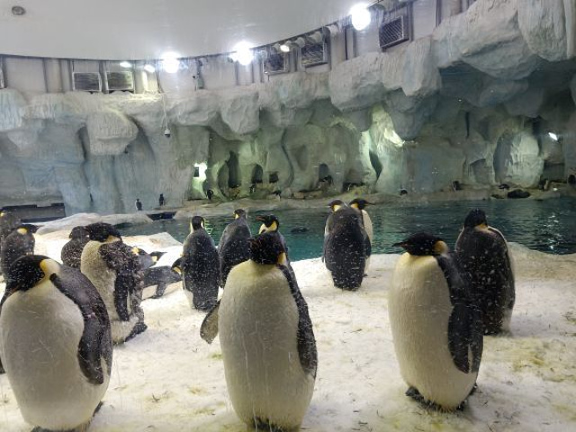 第一次来海洋馆,感觉好神奇啊!水母,白鲸,海豚,海豹,海象,企鹅,北极狐,北极熊,各有各的可爱,还有其他的陆地动物,也都很值得观赏。园区内有激流勇进等很多惊险的娱乐项目,但是如果入园晚的话,一天时间就好紧张,几乎没有时间玩,因为还需要排队。游览是要关注几场表演,包括海豚的,白鲸的,都很好看,只是觉得动物们有点可怜。晚上有很炫酷的烟花秀,配合着七彩光下的喷泉表演,还是很值得一看的。园区里的餐厅都挺贵的,建议自己偷偷带些吃的。