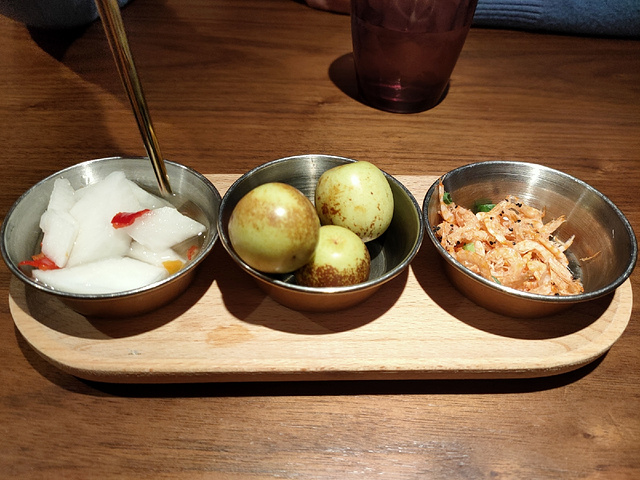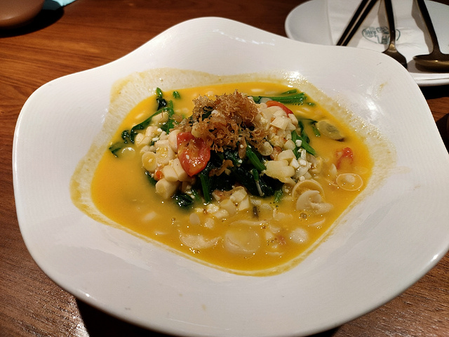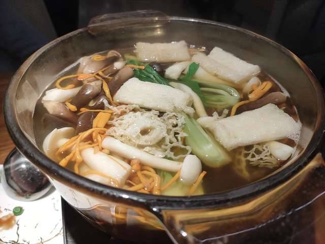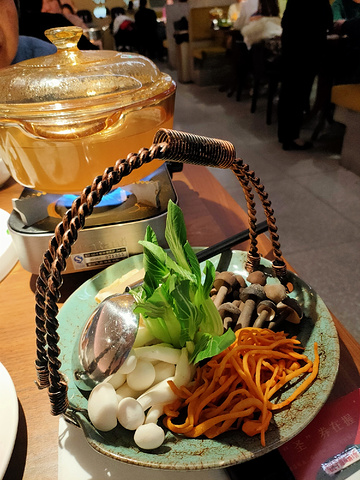 [薄荷]环境: 位于湖滨银泰E区三楼,门面不大,但是里面有上下两层。 [服务铃]服务: 一直觉得开在商场里的餐厅都不注重服务,这家是个例外。从进门开始,服务人员一直态度很好,从餐前的小食,到过程中的询问菜是否合口味,到最后送上漱口水、牙线棒、糖等,服务都很到位。 之前在总店吃过,留下了深刻的印象。这家分店的口味和服务也不输总店。手捏菜毛豆蛋黄烩湖蟹,很新鲜的搭配,一份里面足足有三个湖蟹。干贝上汤菠菜也很鲜美,梅子糖醋排骨也很好吃,老火菌菇汤是把新鲜的蘑菇和蔬菜端上桌,由服务员下锅现场煮的。 正值圣诞季,还参加了店家的抽奖活动,中了一份南瓜露,冰冰甜甜的,很爽口,连平时不爱吃南瓜的我也觉得很好吃。不过玉米汁个人觉得不太好吃,太甜了,有点齁。