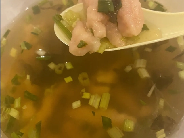 辣五花肉烧饼昨天吃了甜的今天尝试辣的,依旧很好吃。特别酥脆,完全可以接受的微辣,不需要喝水的那种。 瘦肉丸虽然也裹了淀粉,已经很良心了。量大肉多,放了醋漂着葱芹菜的汤很开胃。 火山石烤肠感觉大家都是一个供应商,没太大差别。